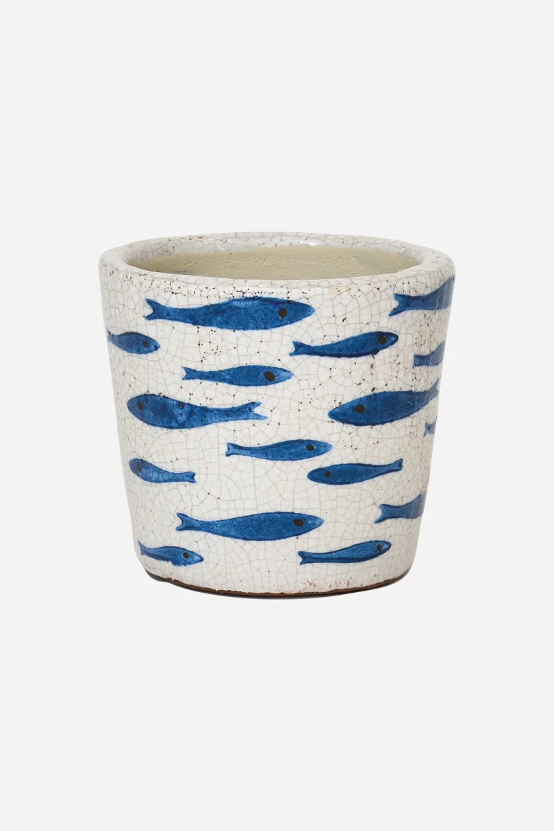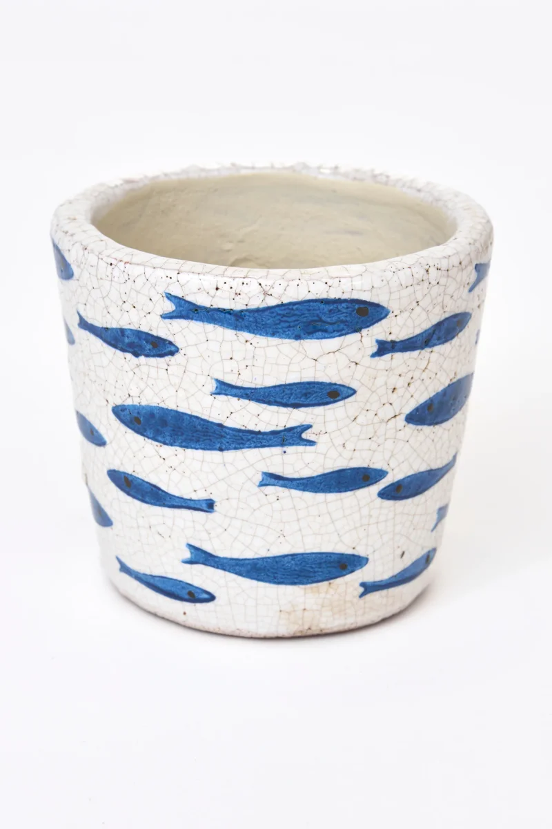 Maceta de terracota decorada con motivo de peces en azul y acabado craquelado. Una pieza de estilo costero que aporta carácter y un toque artesanal a cualquier espacio.