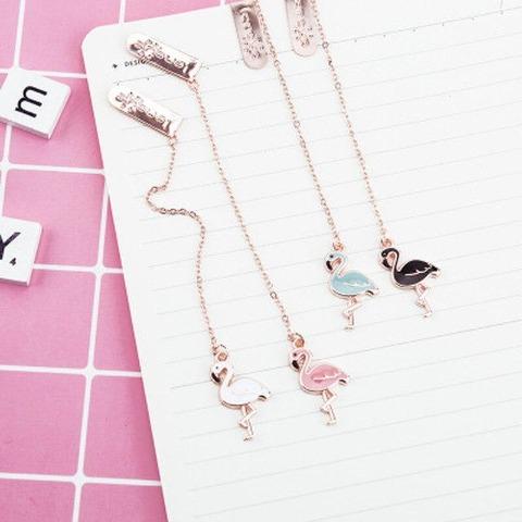 Marque-page en métal, fin et insolite, il est muni d’une petite pince couleur rosée qui maintien une chainette au bout de laquelle est suspendue un élégant petit flamant rose.