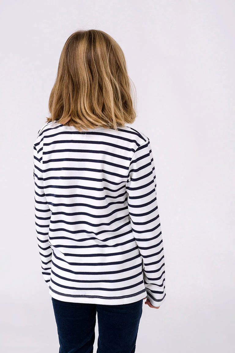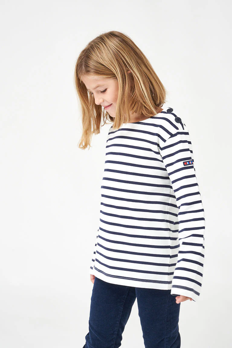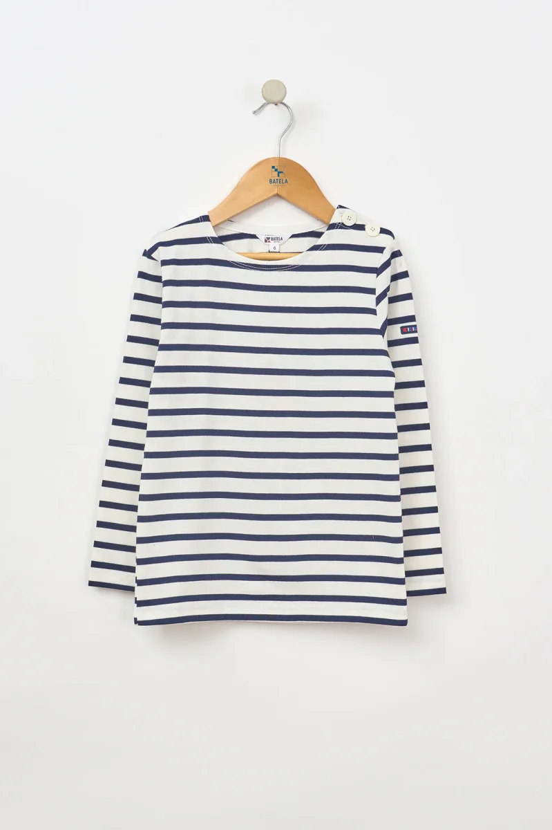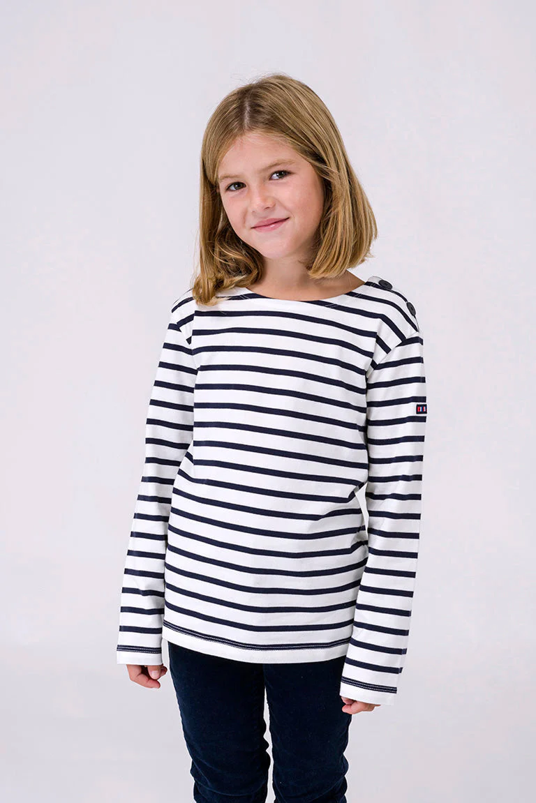 Camiseta infantil de rayas marineras, confeccionada en 100% algodón de 280 gramos, un tejido de punto grueso, resistente y cómodo.