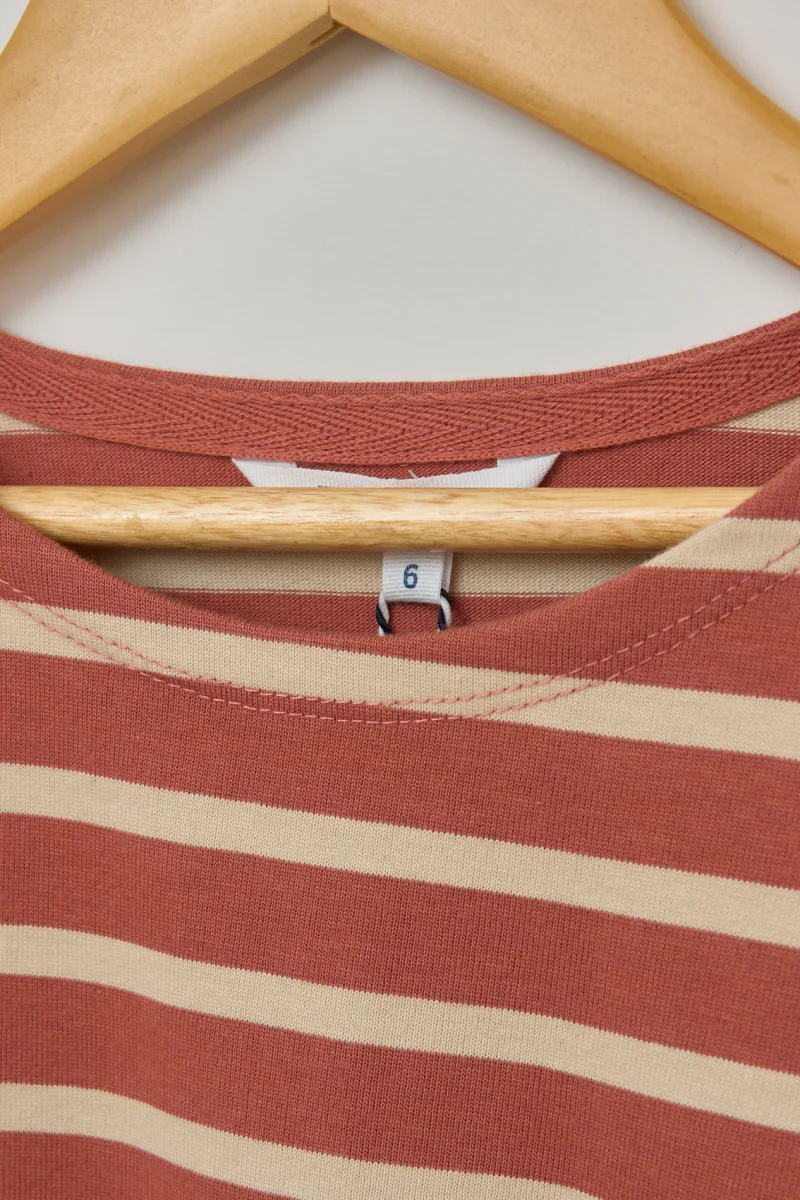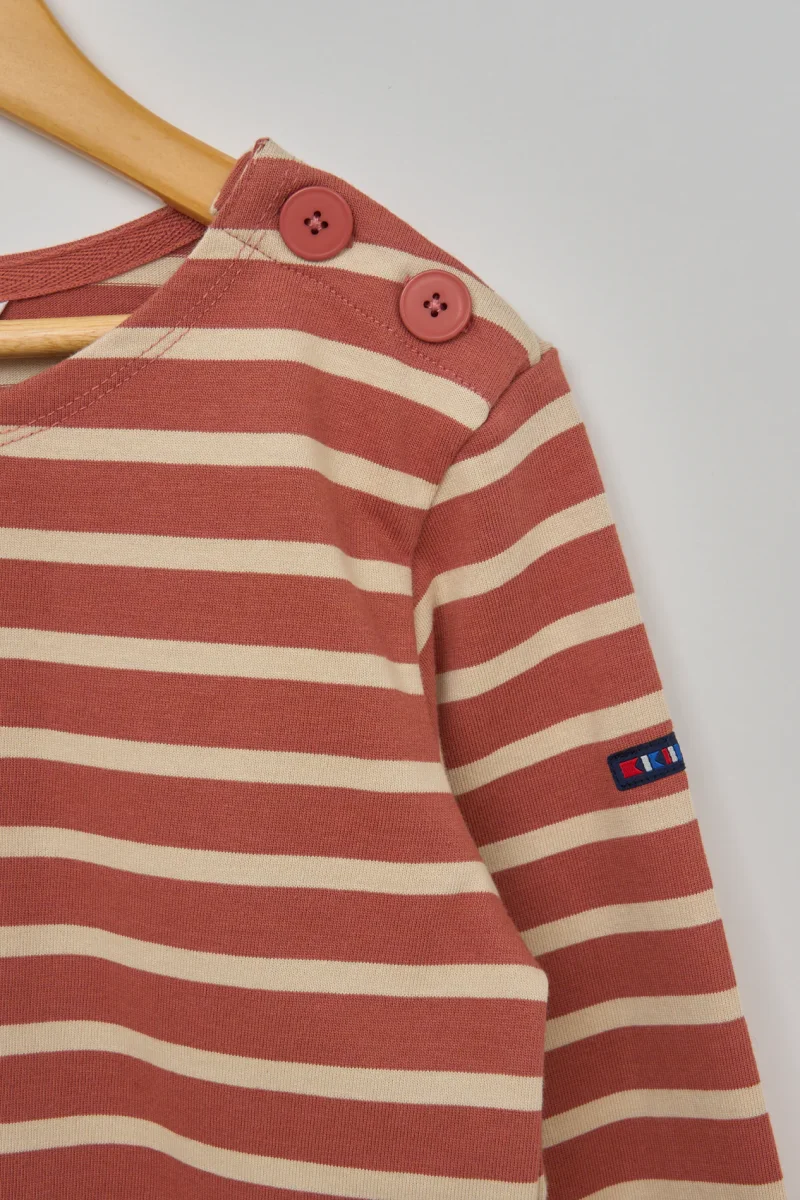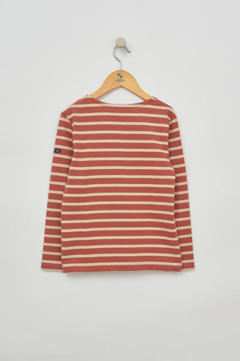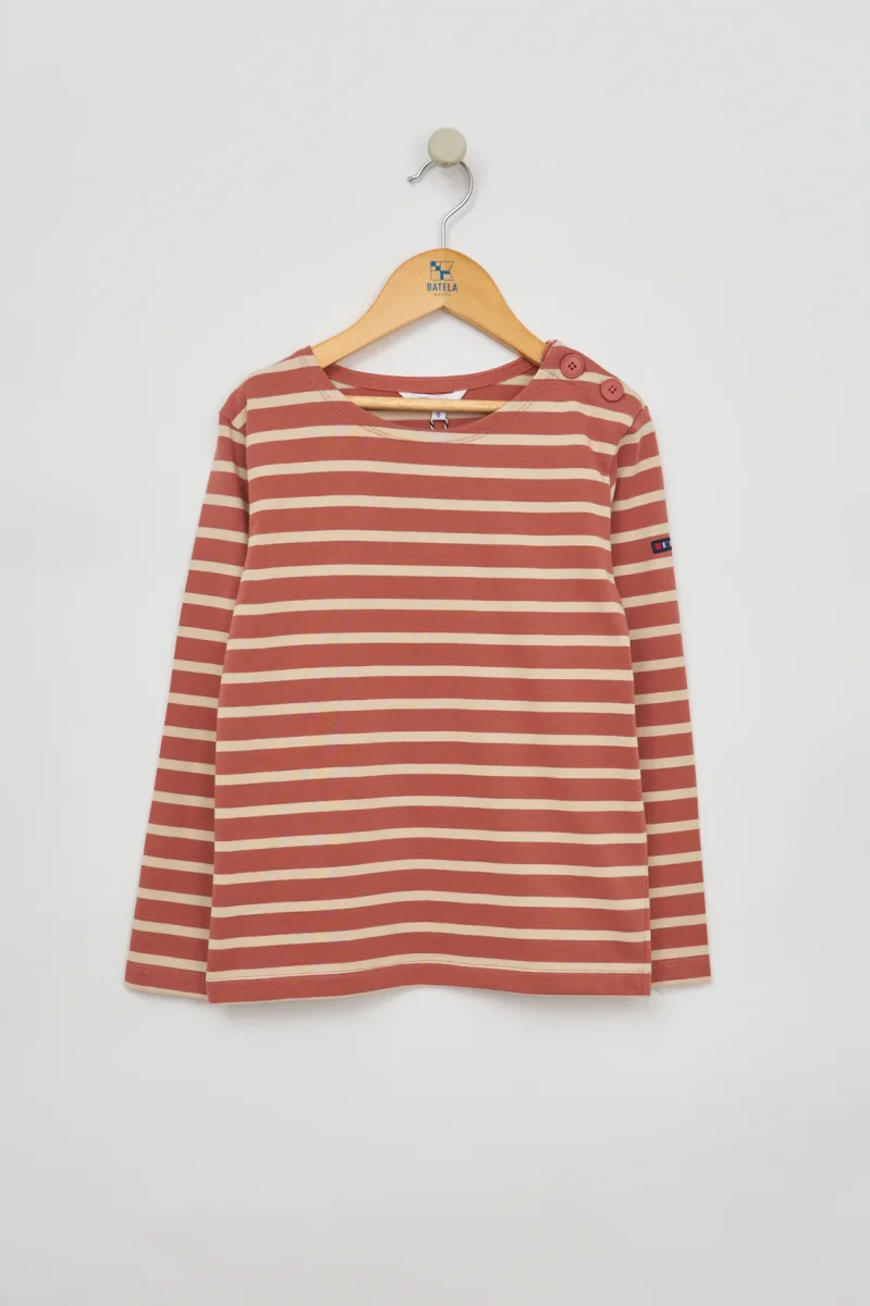 Camiseta infantil de rayas marineras, confeccionada en 100% algodón de 280 gramos, un tejido de punto grueso, resistente y cómodo.
