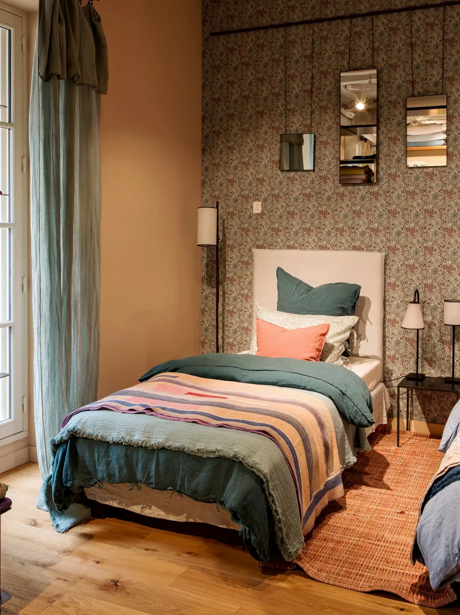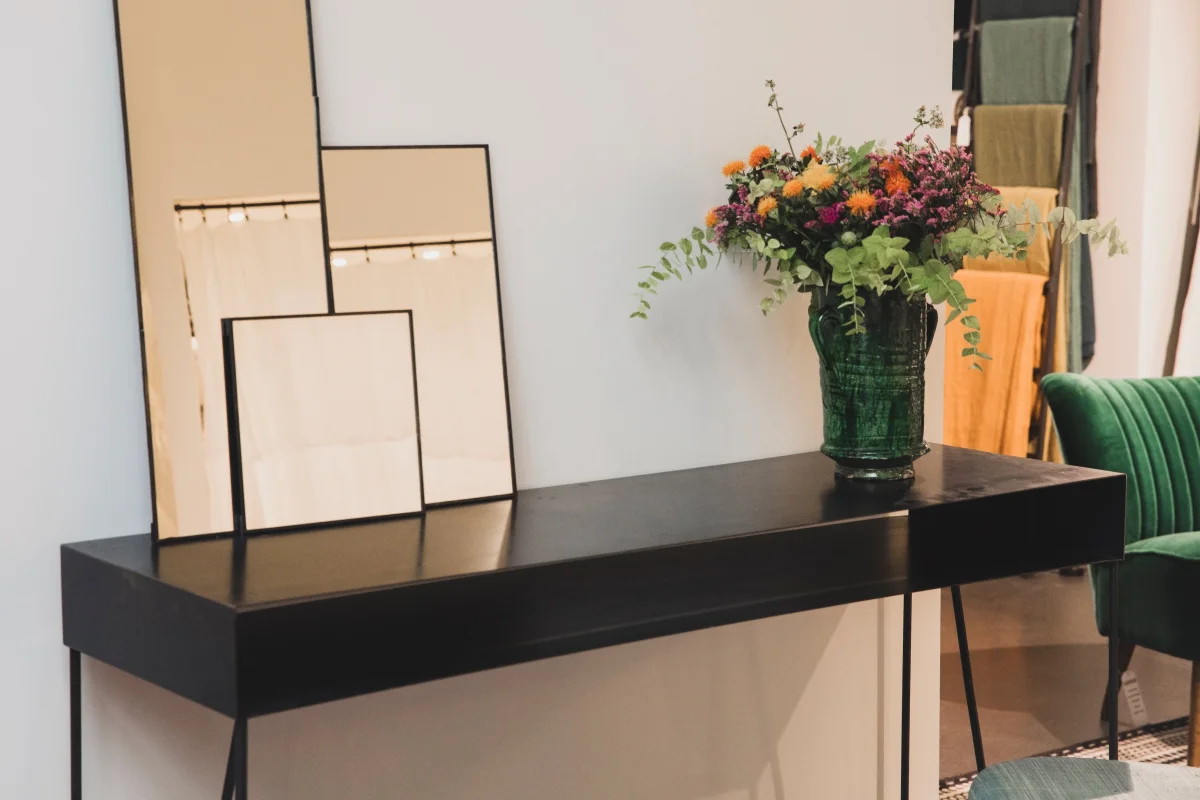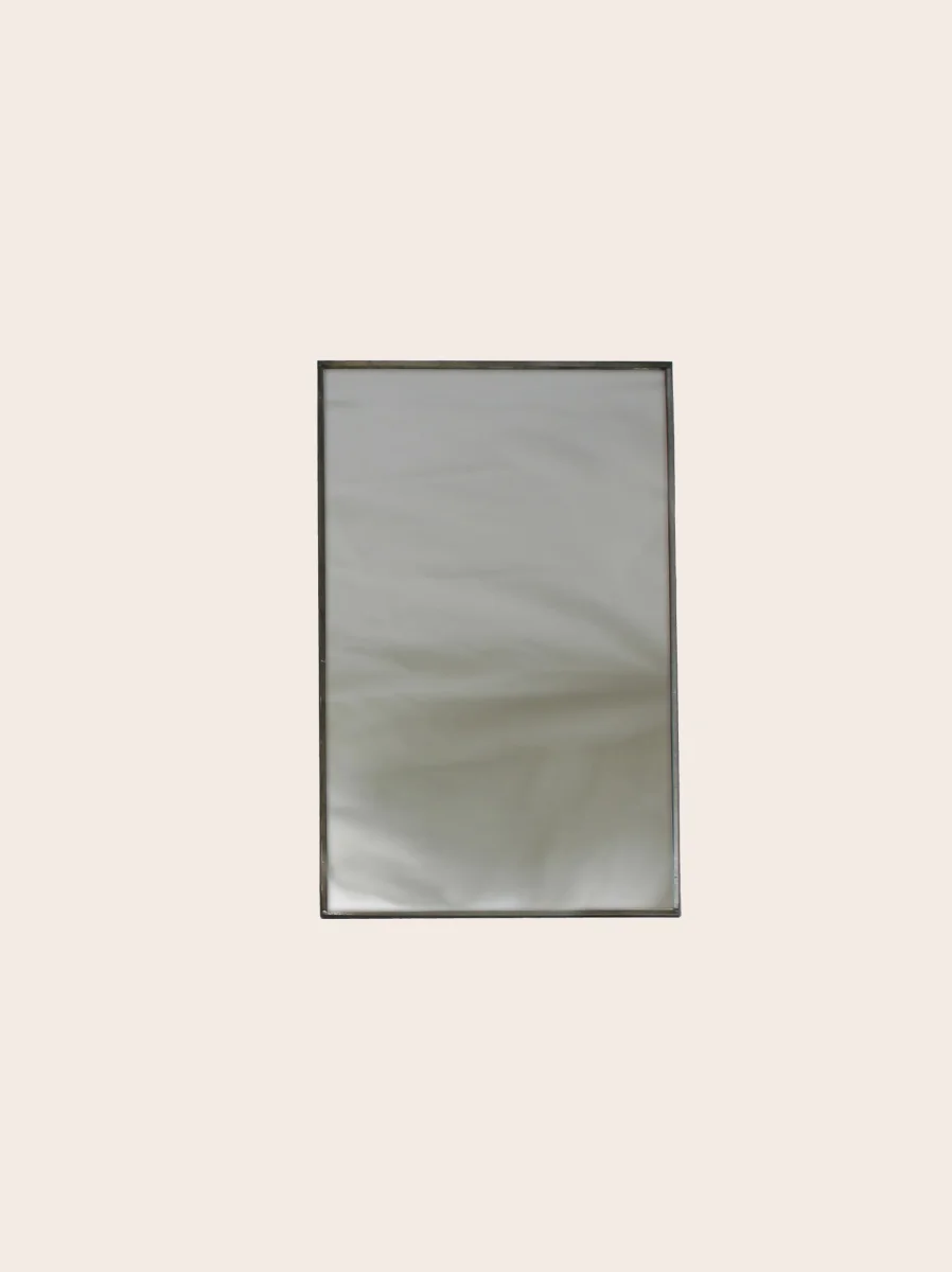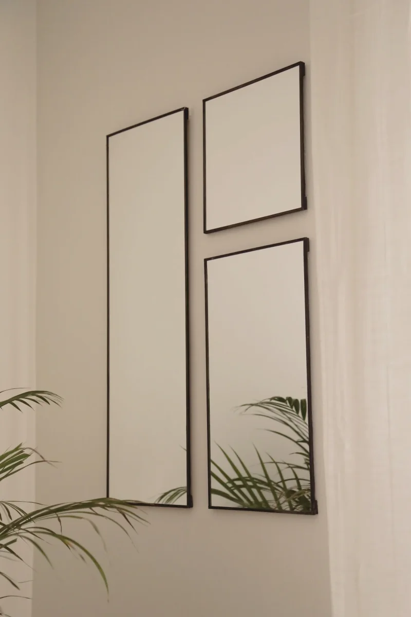 Un fin trait de métal souligne ces miroirs simplissimes : trois formes à combiner pour créer sa propre version du miroir Narcisse.