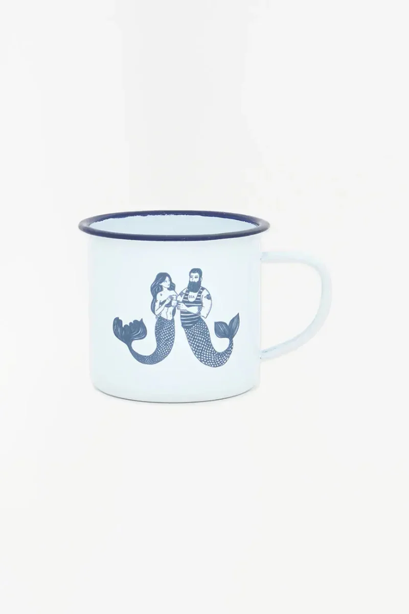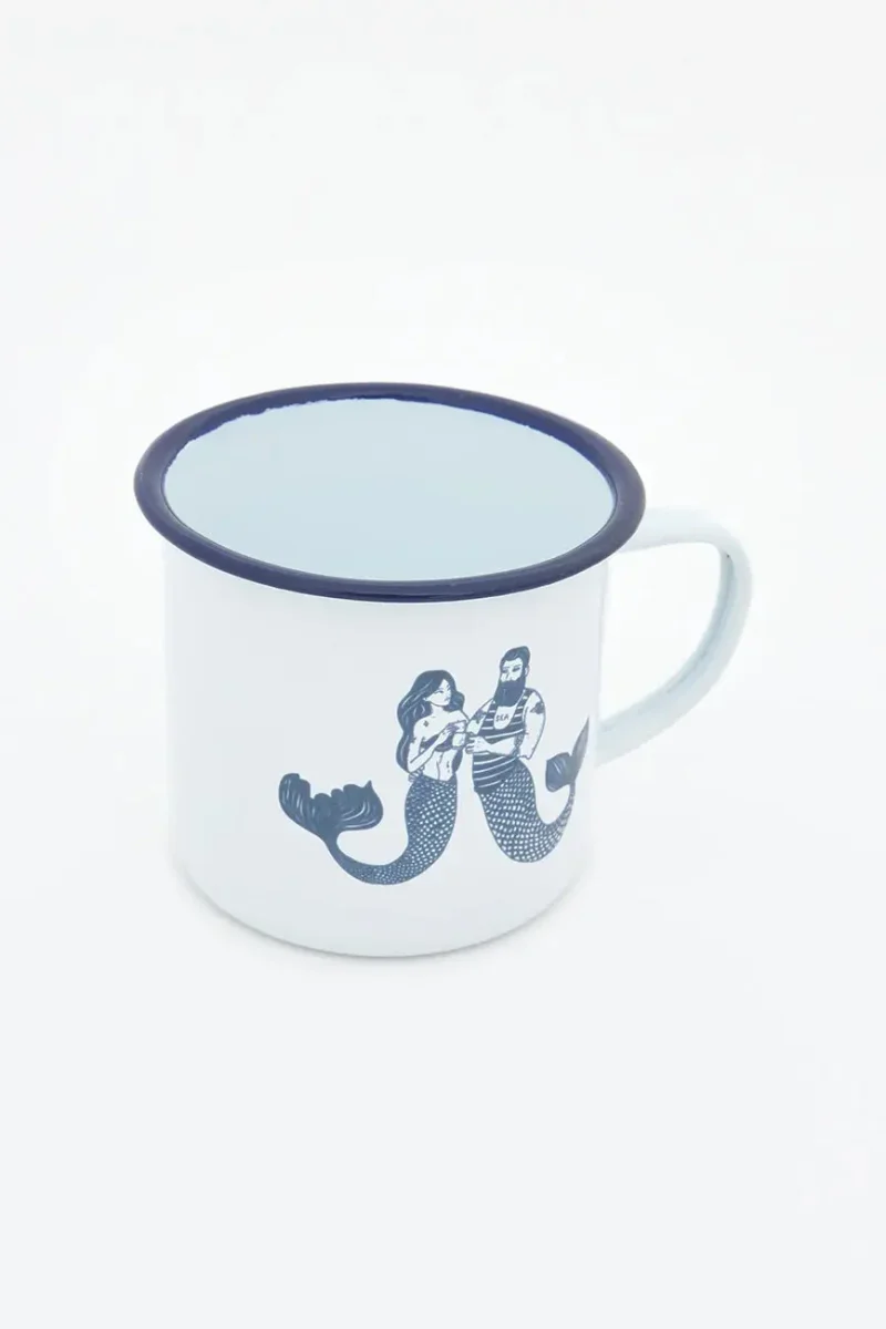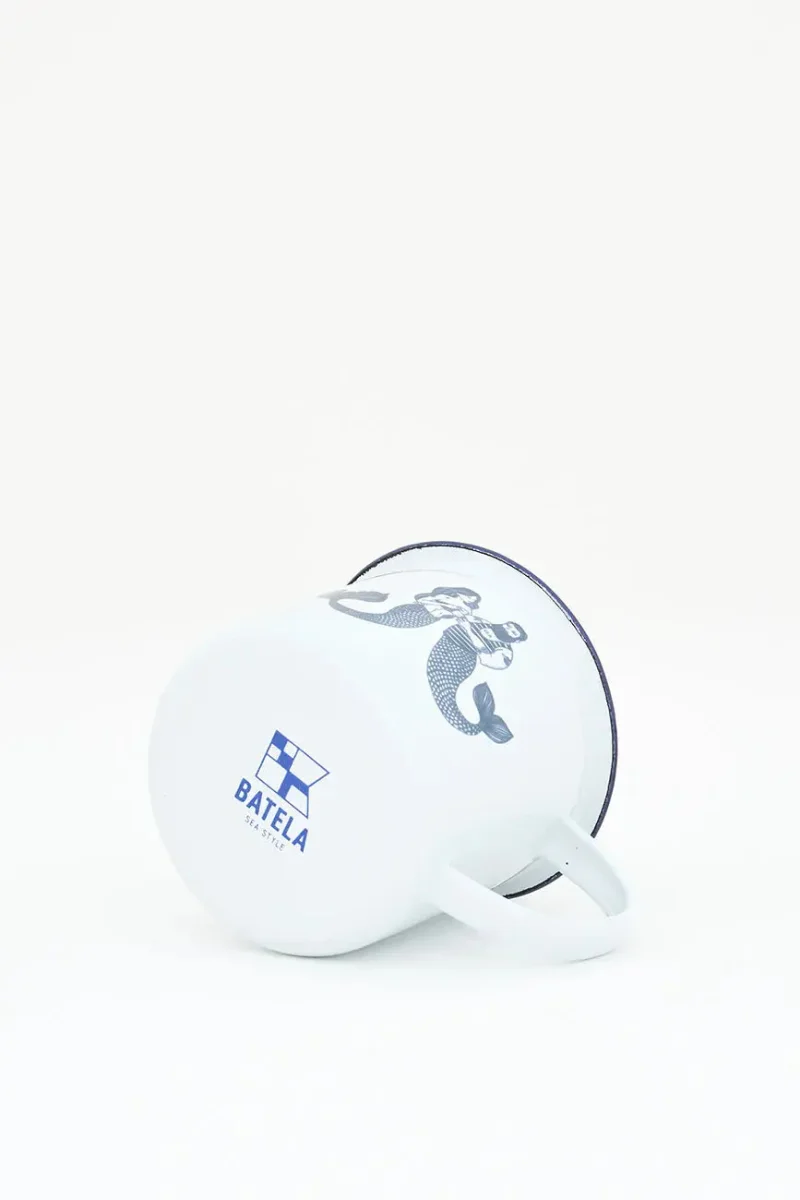 Mug de metal esmaltado con motivo de sirenas en tonos blanco y azul, ideal para quienes buscan un toque de diseño náutico en su día a día. Perfecta para disfrutar de tus bebidas favoritas, como café o té, mientras decoras tu hogar con un estilo marinero o costero.