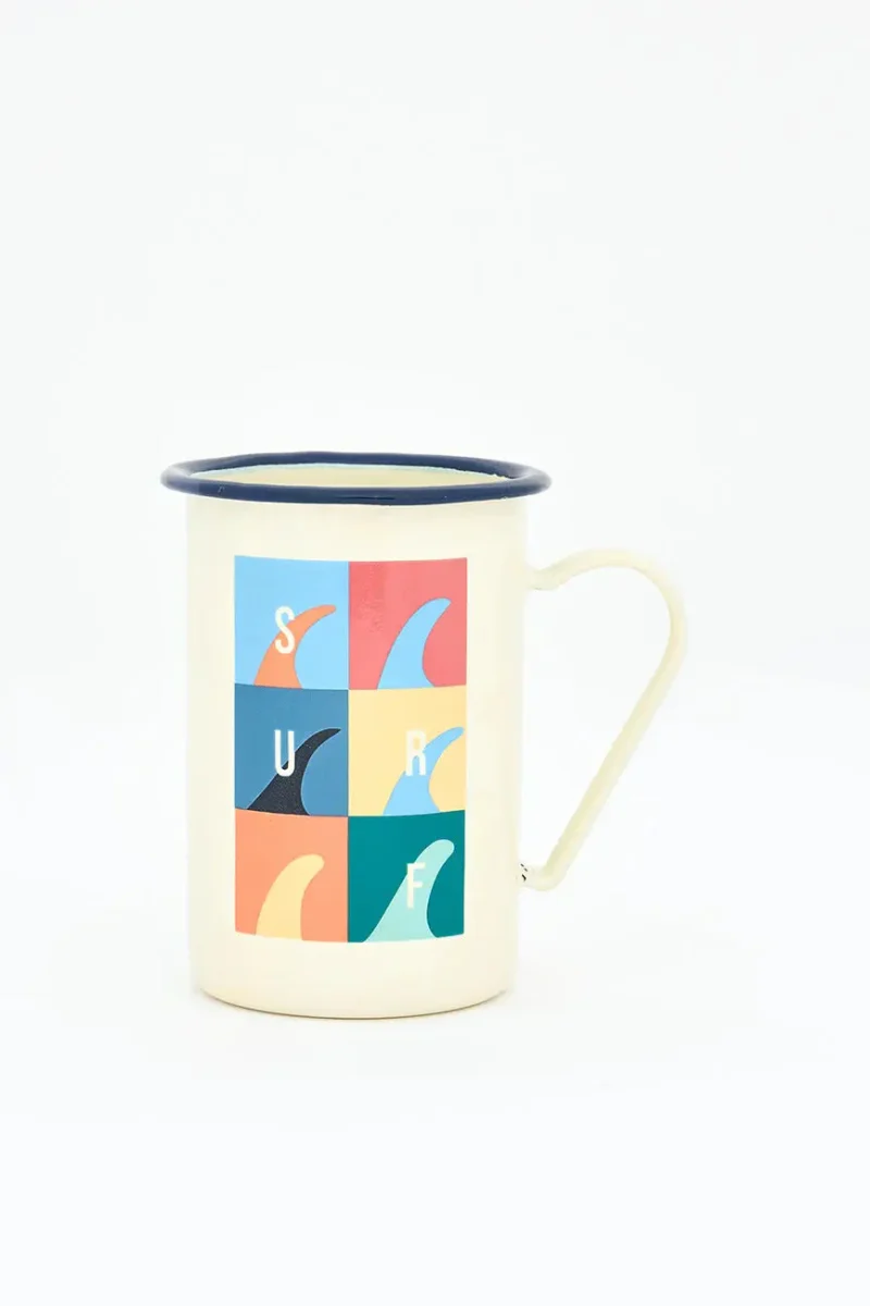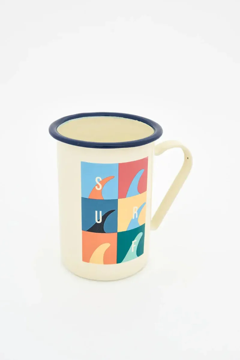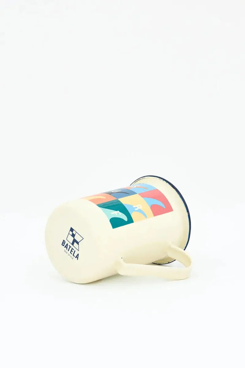 Mug largo de metal esmaltado en color beige con motivos de surf, perfecto para quienes aman los detalles de diseño náutico y estilo marinero. Compacto y resistente, es ideal para disfrutar bebidas o como elemento decorativo en cocinas y estanterías