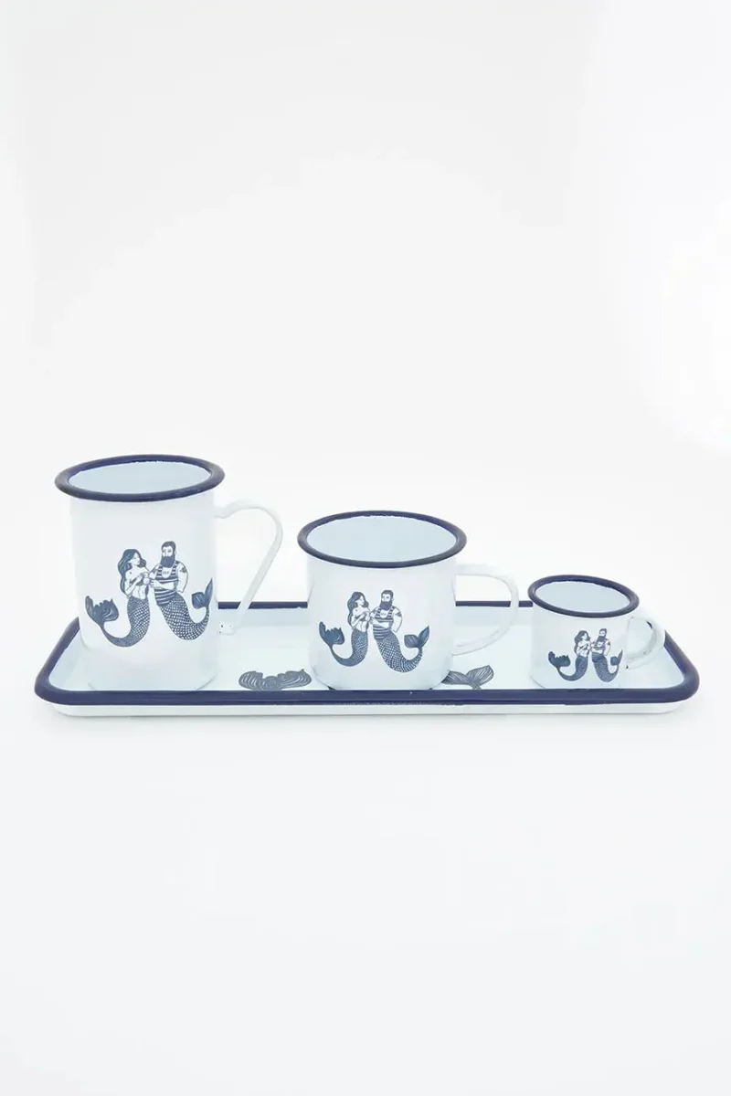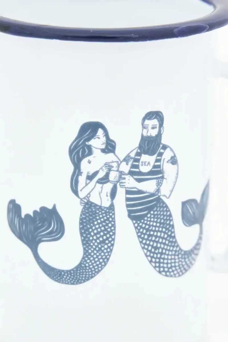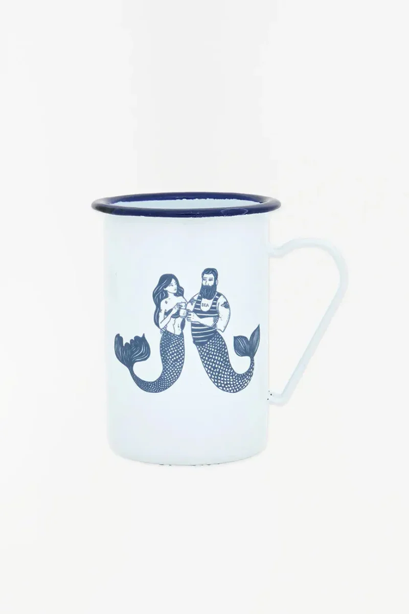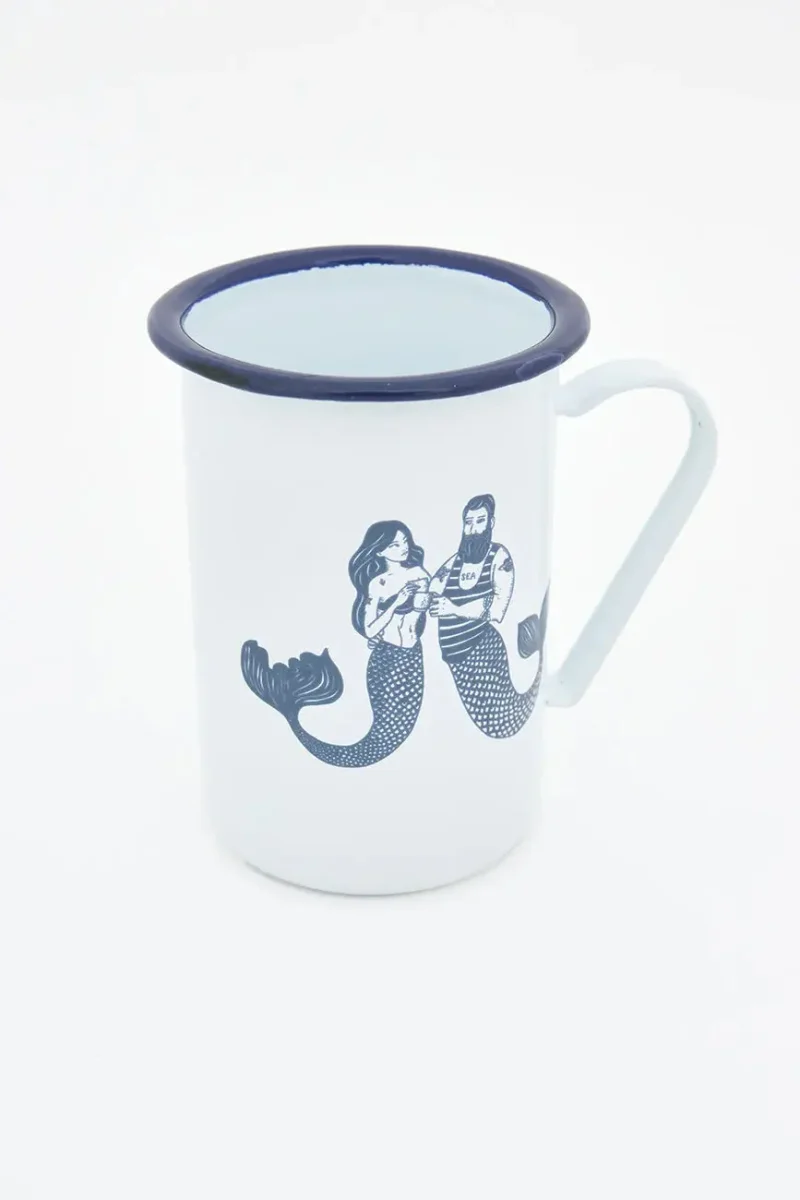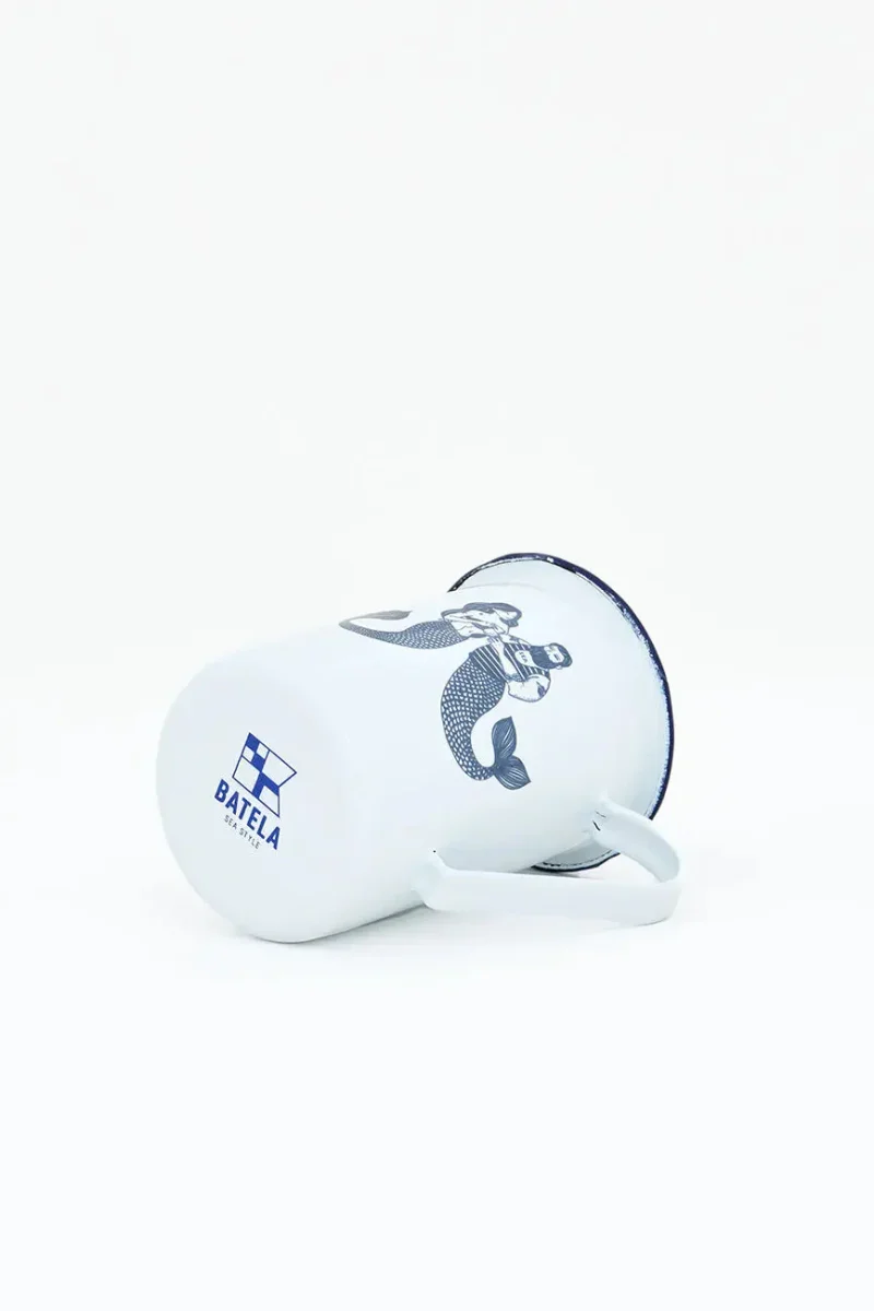 Mug de metal esmaltado alto con motivo de sirenas en tonos blanco y azul, ideal para quienes buscan un toque de diseño náutico en su día a día. Perfecta para disfrutar de tus bebidas favoritas, como café o té, mientras decoras tu hogar con un estilo marinero o costero.