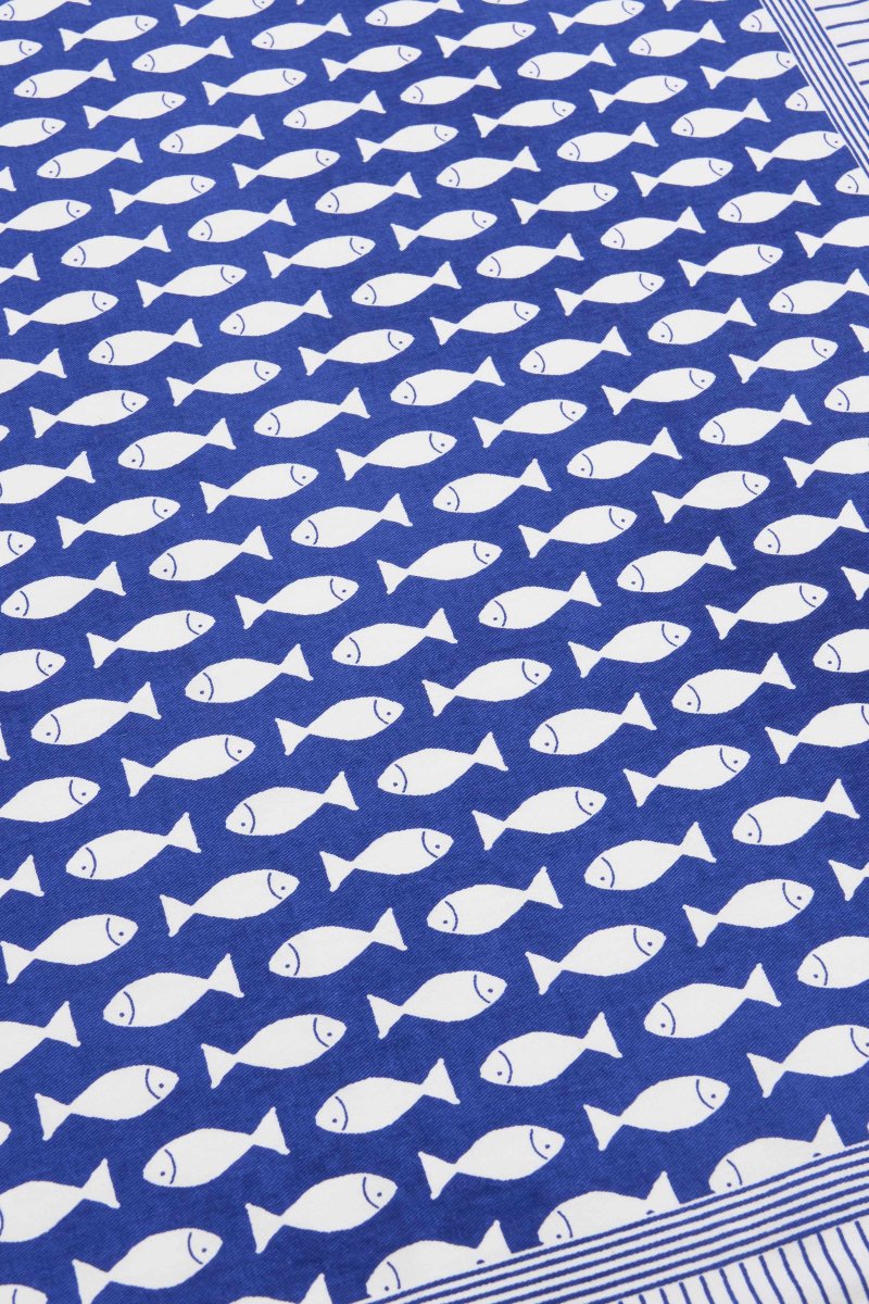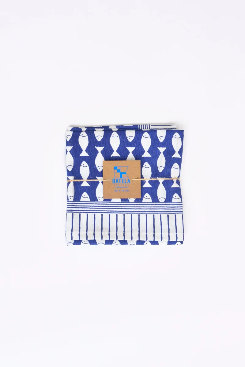 Paño de cocina de algodón con estampado de peces en blanco sobre fondo azul. Un básico funcional y decorativo, ideal para aportar un toque marinero a la cocina.