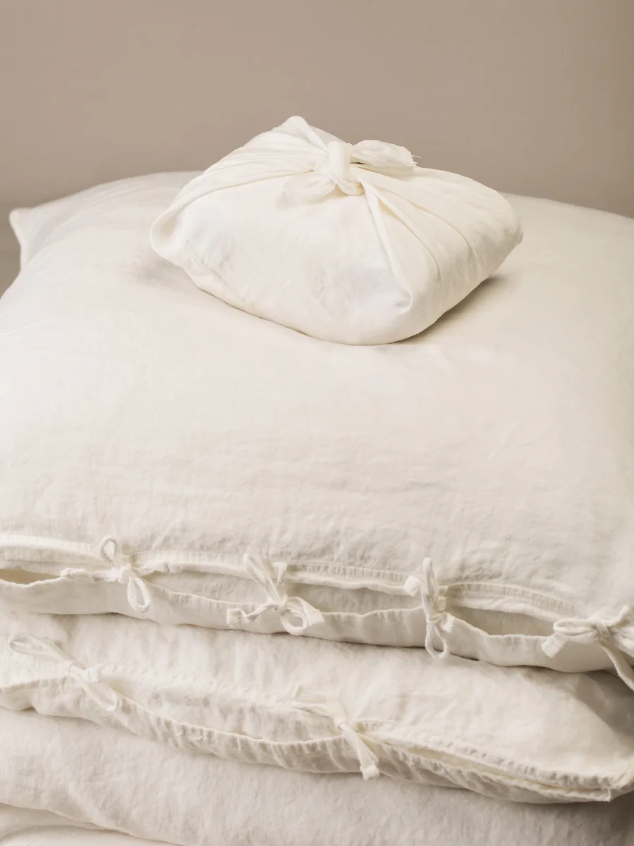 La housse de couette et les taies d’oreiller Selena se caractérisent par une texture légèrement froissée, voluptueuse et douce au contact de la peau, avec des irrégularités recherchées, témoignage d’un savoir-faire artisanal.