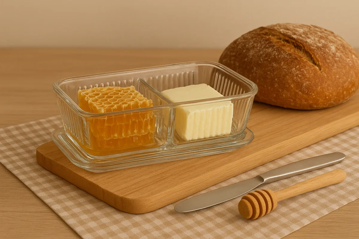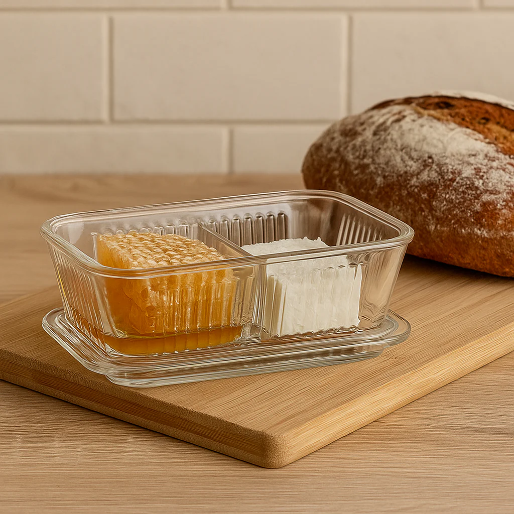 Double compartiment : Sa conception unique avec deux compartiments séparés vous offre une flexibilité totale. Conservez votre beurre dans une section et remplissez l’autre avec de la confiture, du miel, de la pâte à tartiner ou même des herbes fraîches. C’est le moyen parfait de réduire l’encombrement sur votre table.