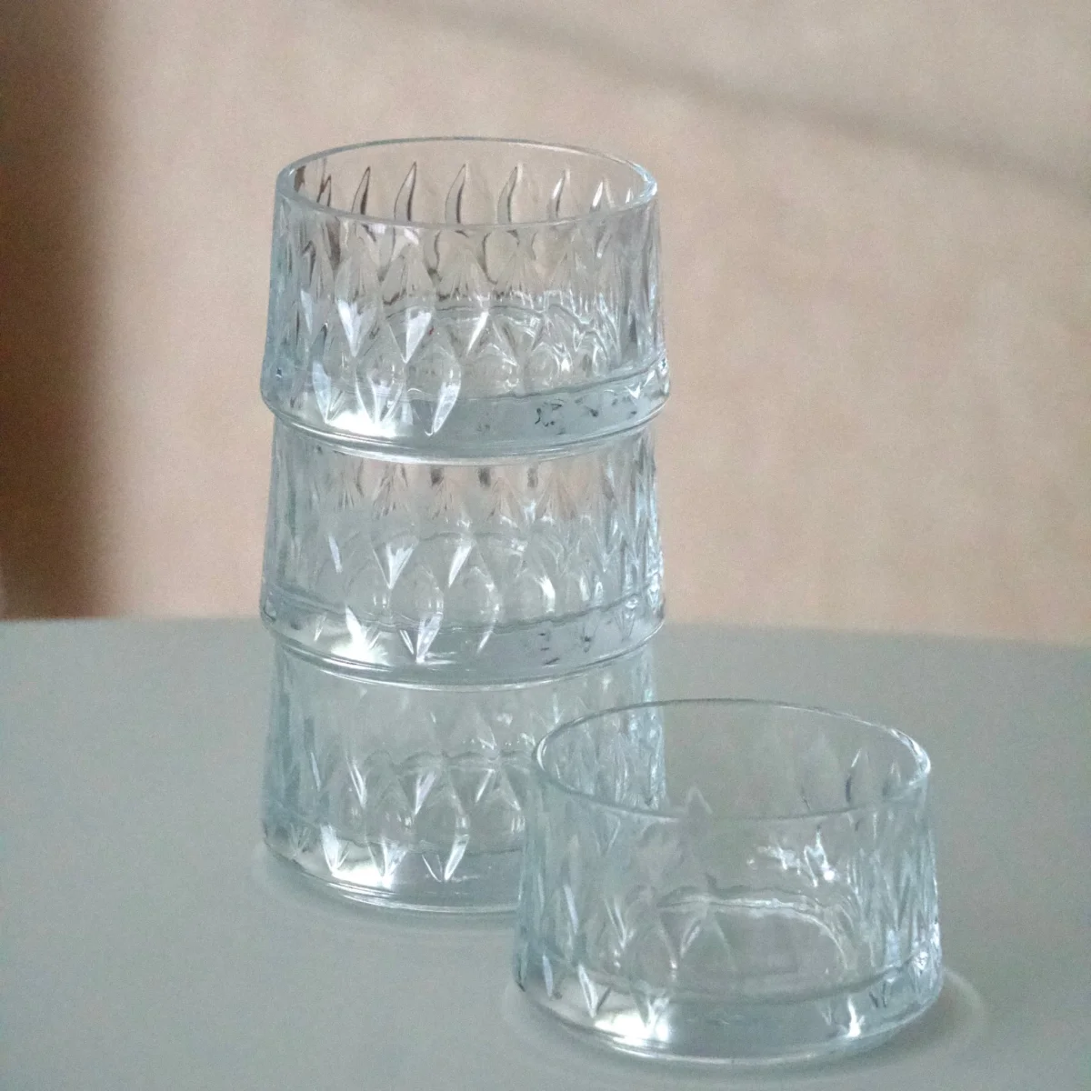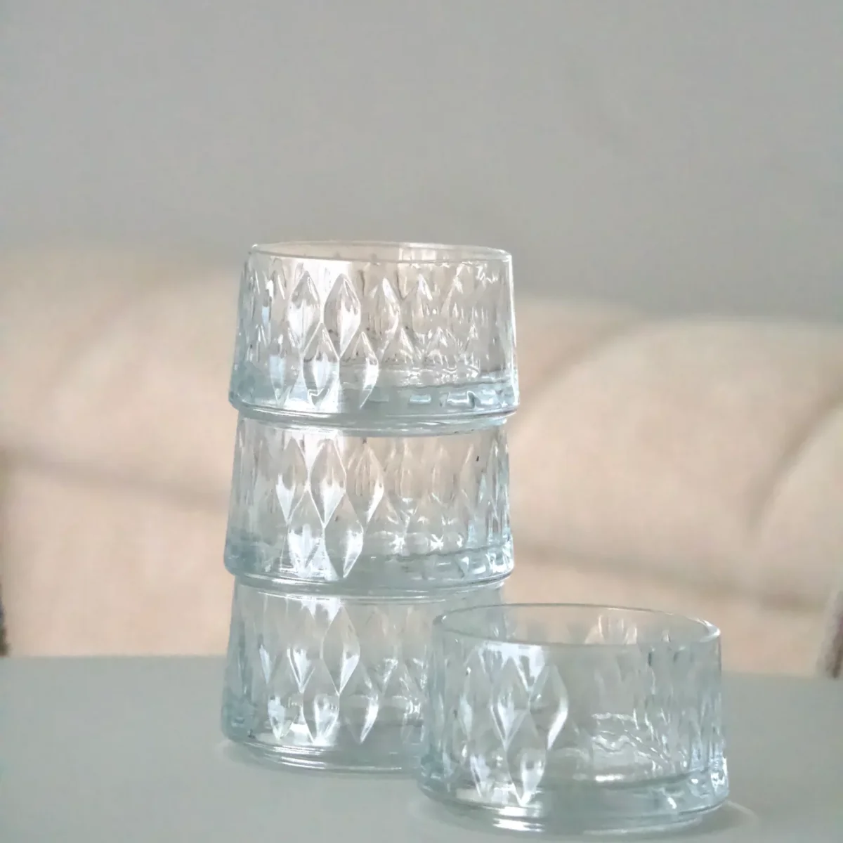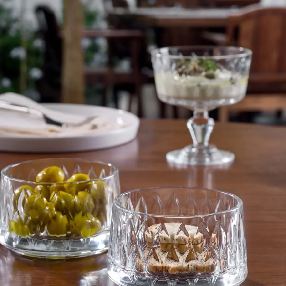 Ce set se compose de quatre petits bols parfaits pour les portions individuelles. Leur corps est fabriqué en verre de haute qualité, arborant un motif texturé facetté (en losange) qui capte magnifiquement la lumière. Le design épuré, typique de la verrerie classique, garantit une présentation impeccable de toutes vos préparations.
