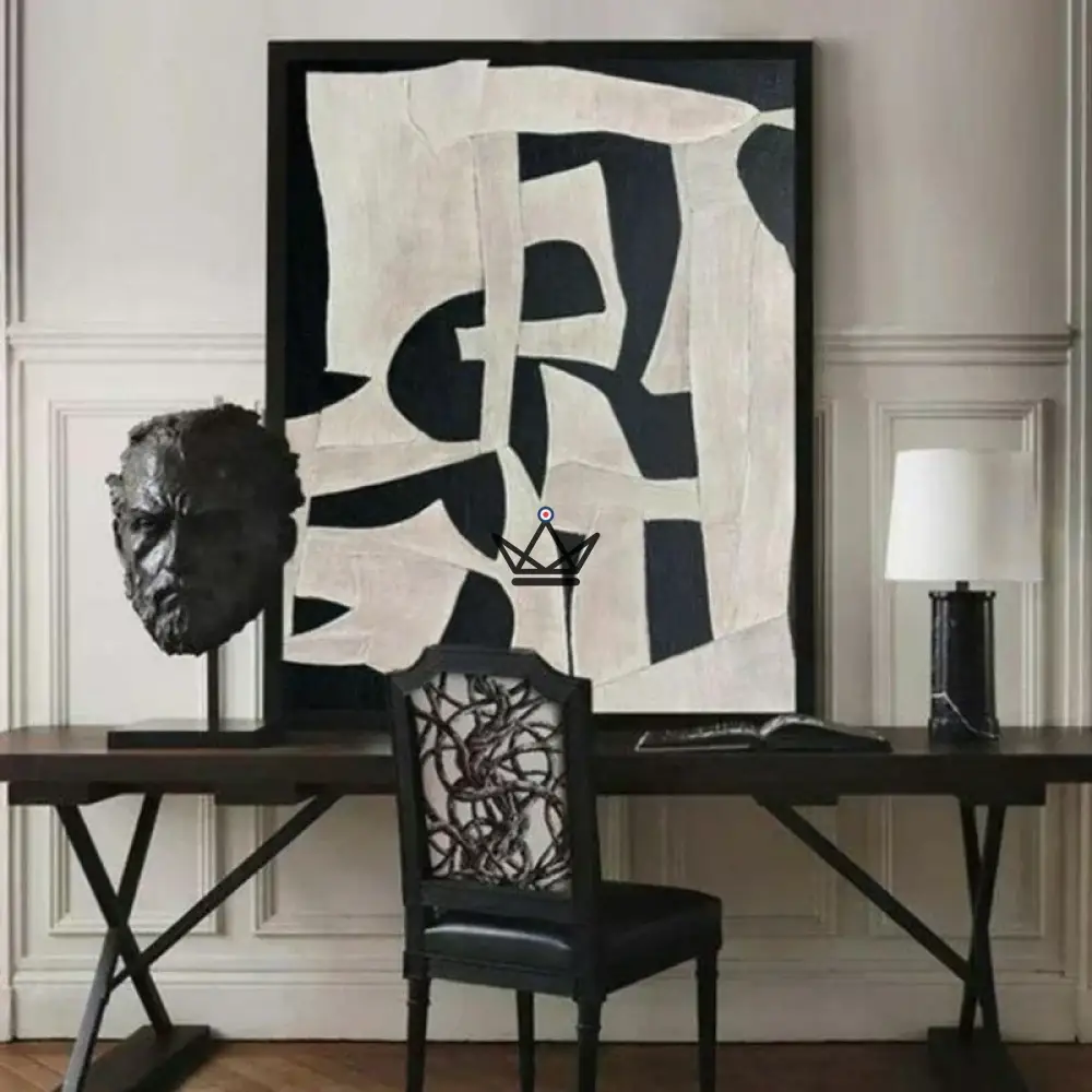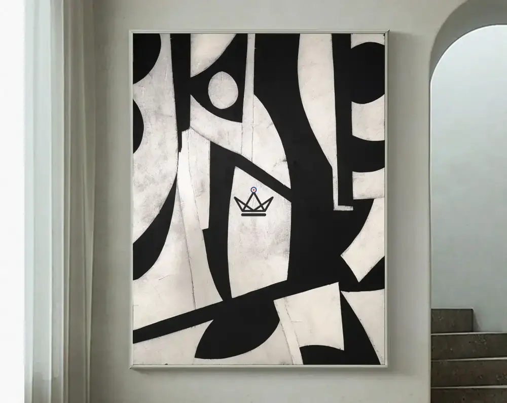 Description : Avec ses courbes et lignes fluides, cette œuvre mélange précision géométrique et fluidité. Le contraste entre le noir et le blanc rehausse son esthétique moderne, en faisant une pièce maîtresse dans toute collection.