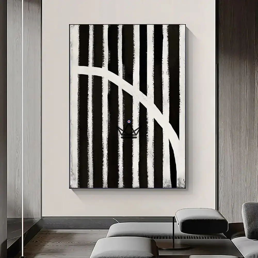 Description : Une pièce audacieuse mettant en avant des lignes blanches sur un fond noir, créant un motif rythmique qui évoque un sens de mouvement et de dynamisme. Parfait pour les intérieurs modernes recherchant une touche artistique.