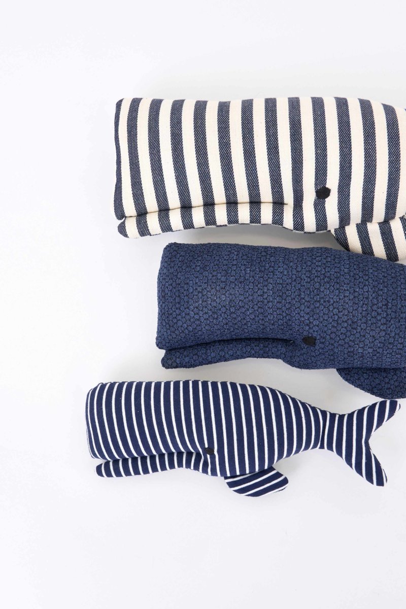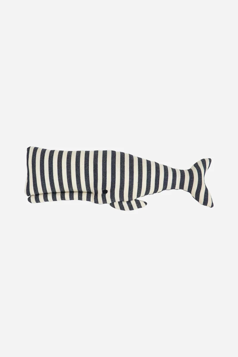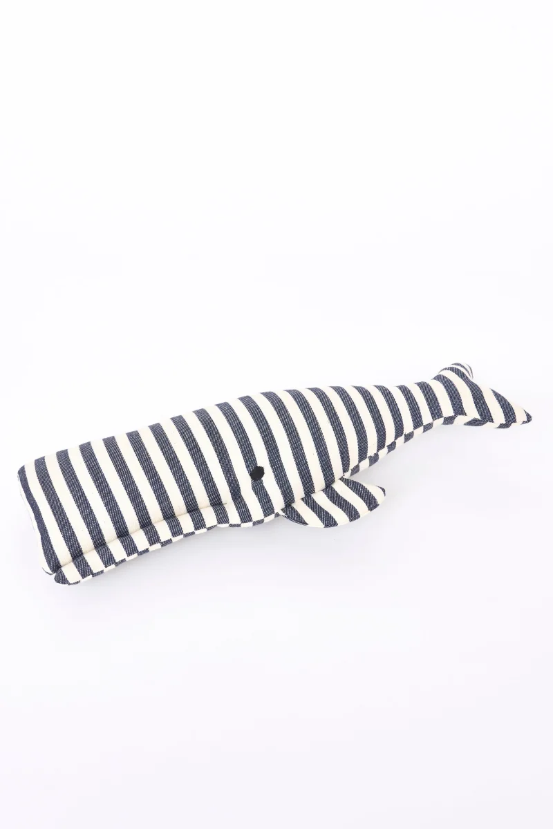 Peluche con forma de ballena decorado con diseño a rayas. Suave y agradable al tacto. Un compañero tierno para los más pequeños.