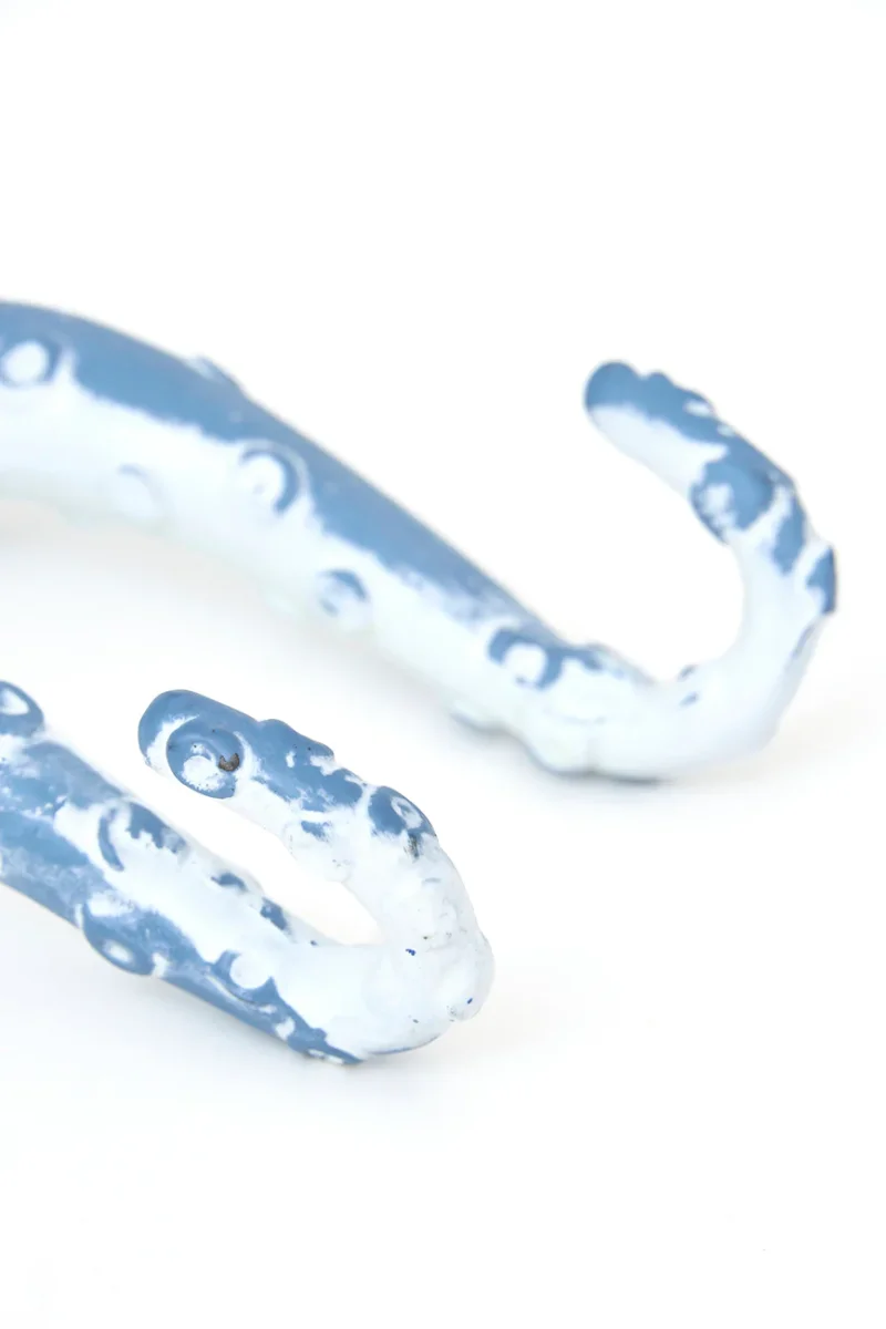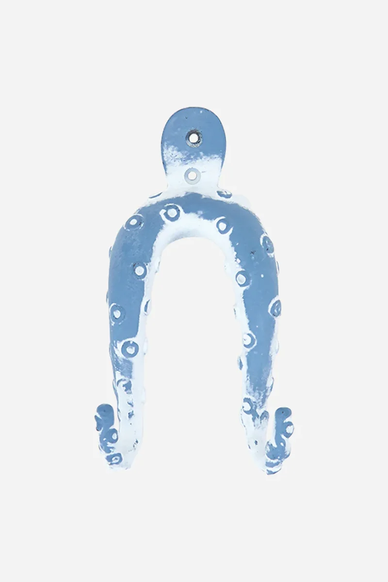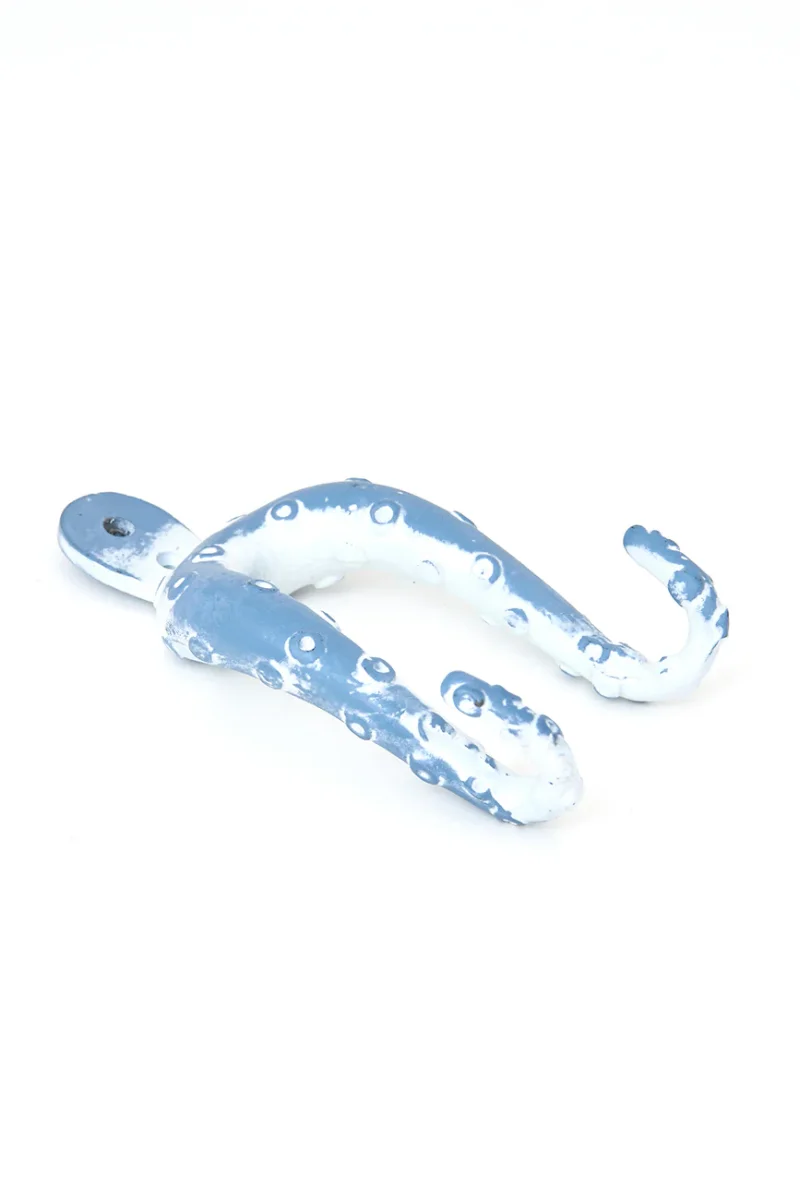 Perchero decorativo de metal con forma de pulpo, pintado en azul cielo con acabado envejecido. Dos de sus tentáculos funcionan como colgadores. Ideal para aportar un toque original y marinero a la pared.