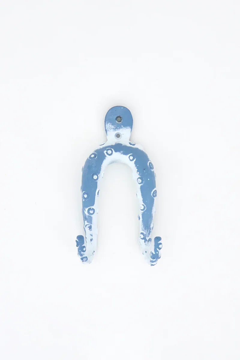 Perchero decorativo de metal con forma de pulpo, pintado en azul cielo con acabado envejecido.
