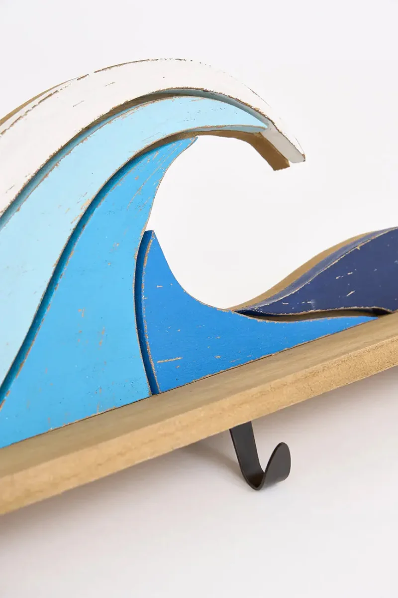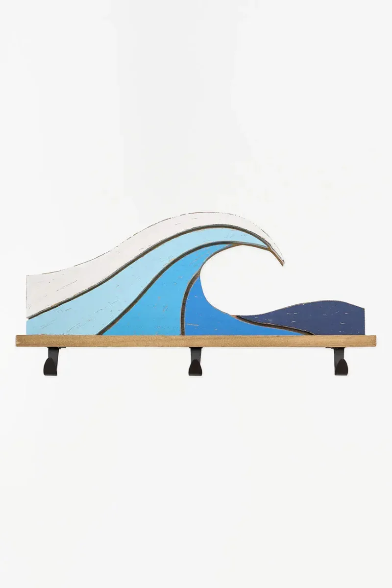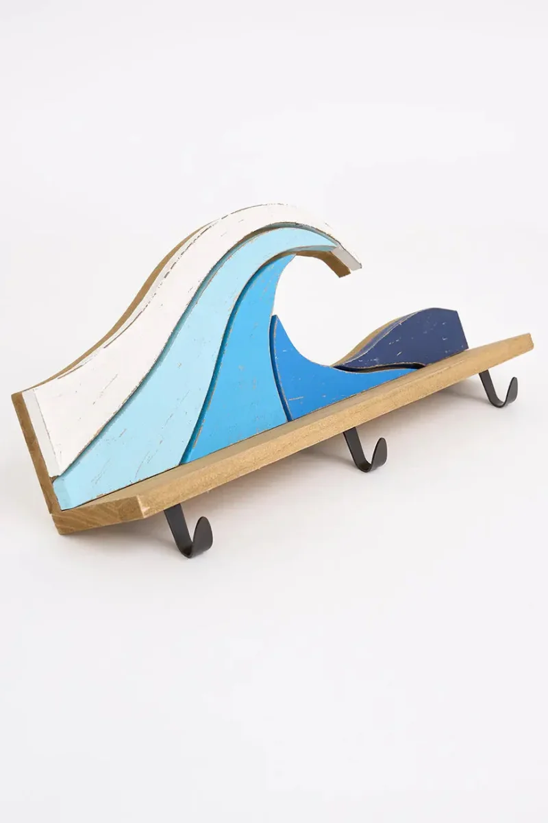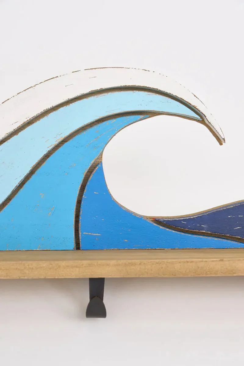 Perchero de madera con forma de ola de mar en tonos azul y blanco, diseñado con 3 colgantes metálicos. Ideal para añadir un toque náutico y funcional a tu entrada o pasillo, combinando estilo y practicidad.