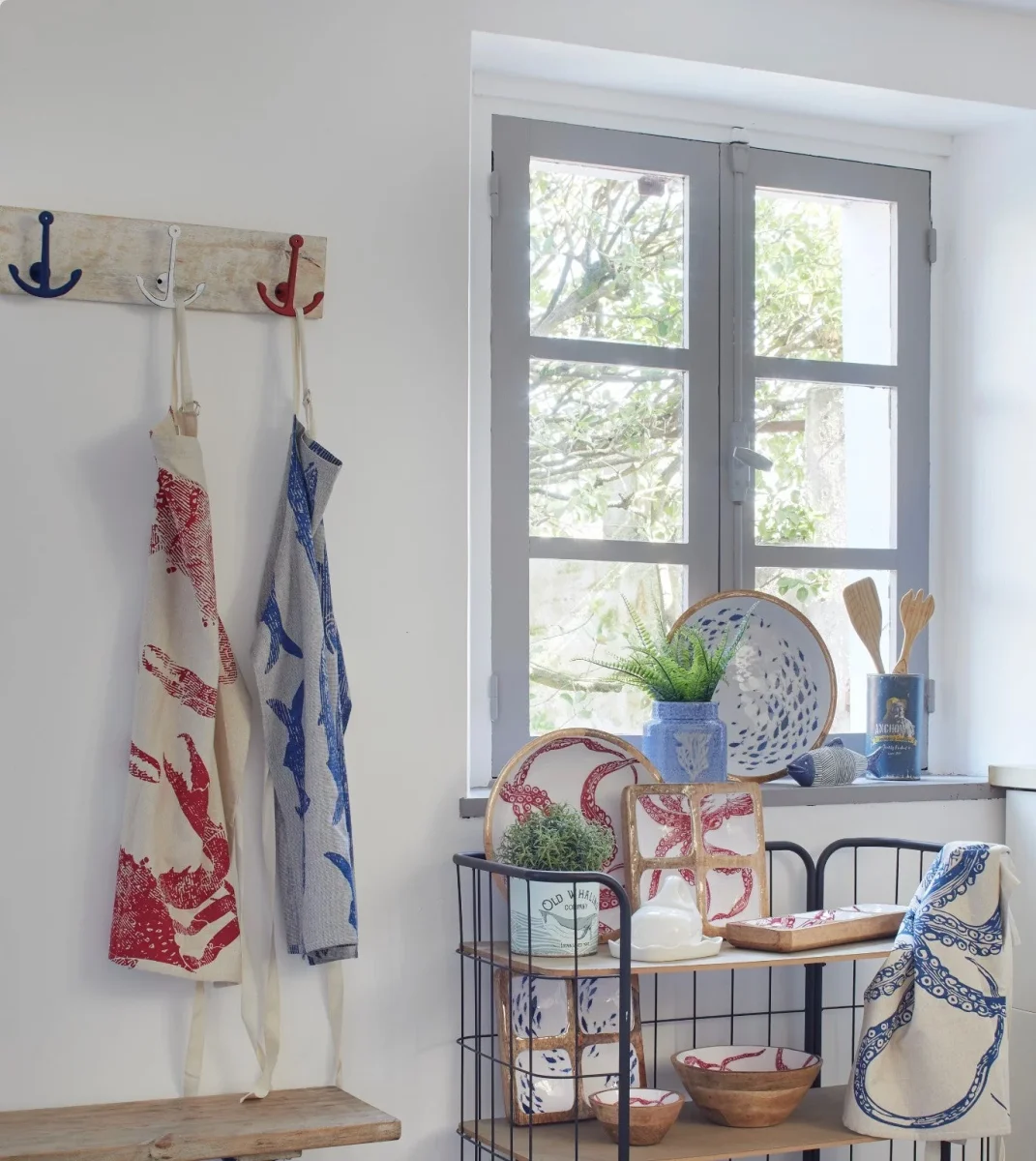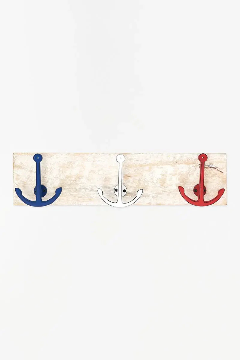 Bonito perchero triple de anclas en tres colores y colocadas en soporte de madera pintado en blanco. Un toque de color que no pasará desapercibido