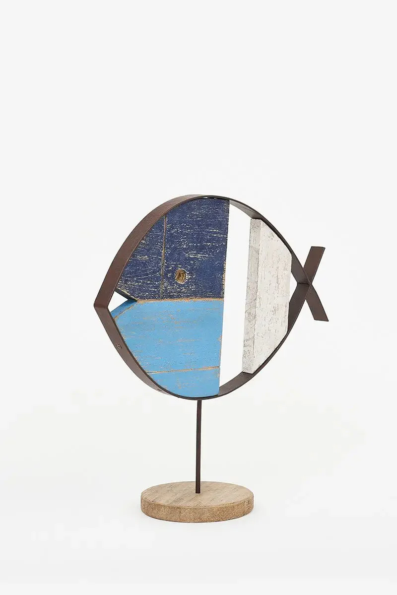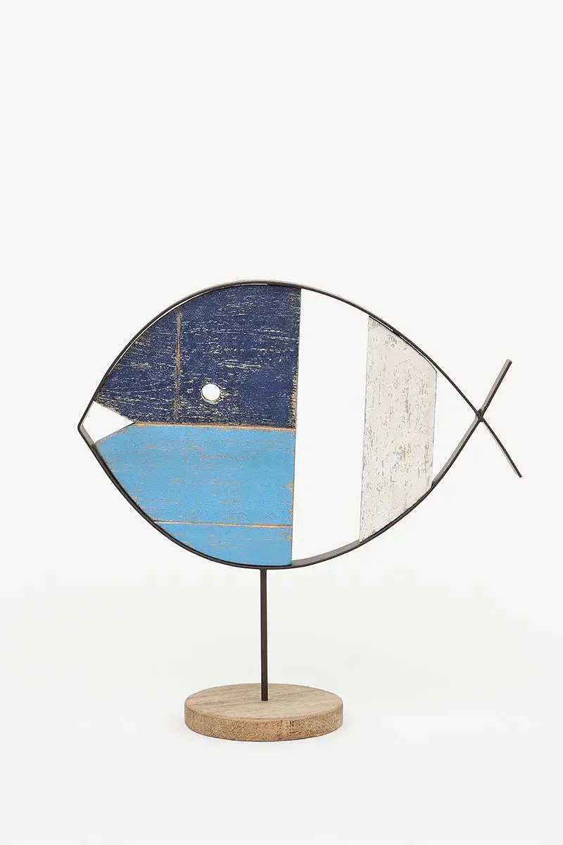 Pez de madera y metal con base de madera. Las partes de madera combinan azul marino, azul cielo y blanco.
