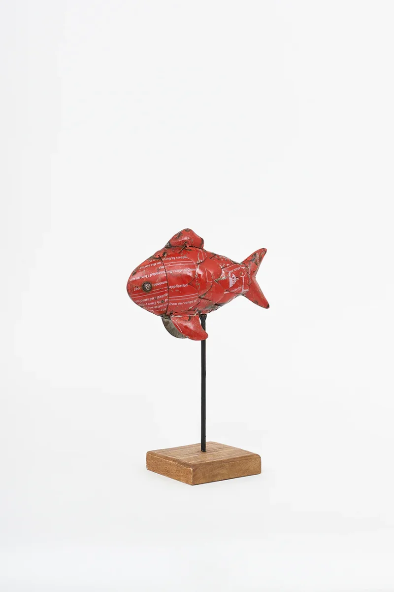Pez de metal reciclado. Recuperado de bidones reciclados. Tiene una pequeñ base de madera.
