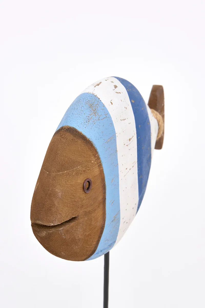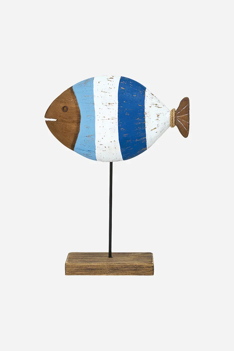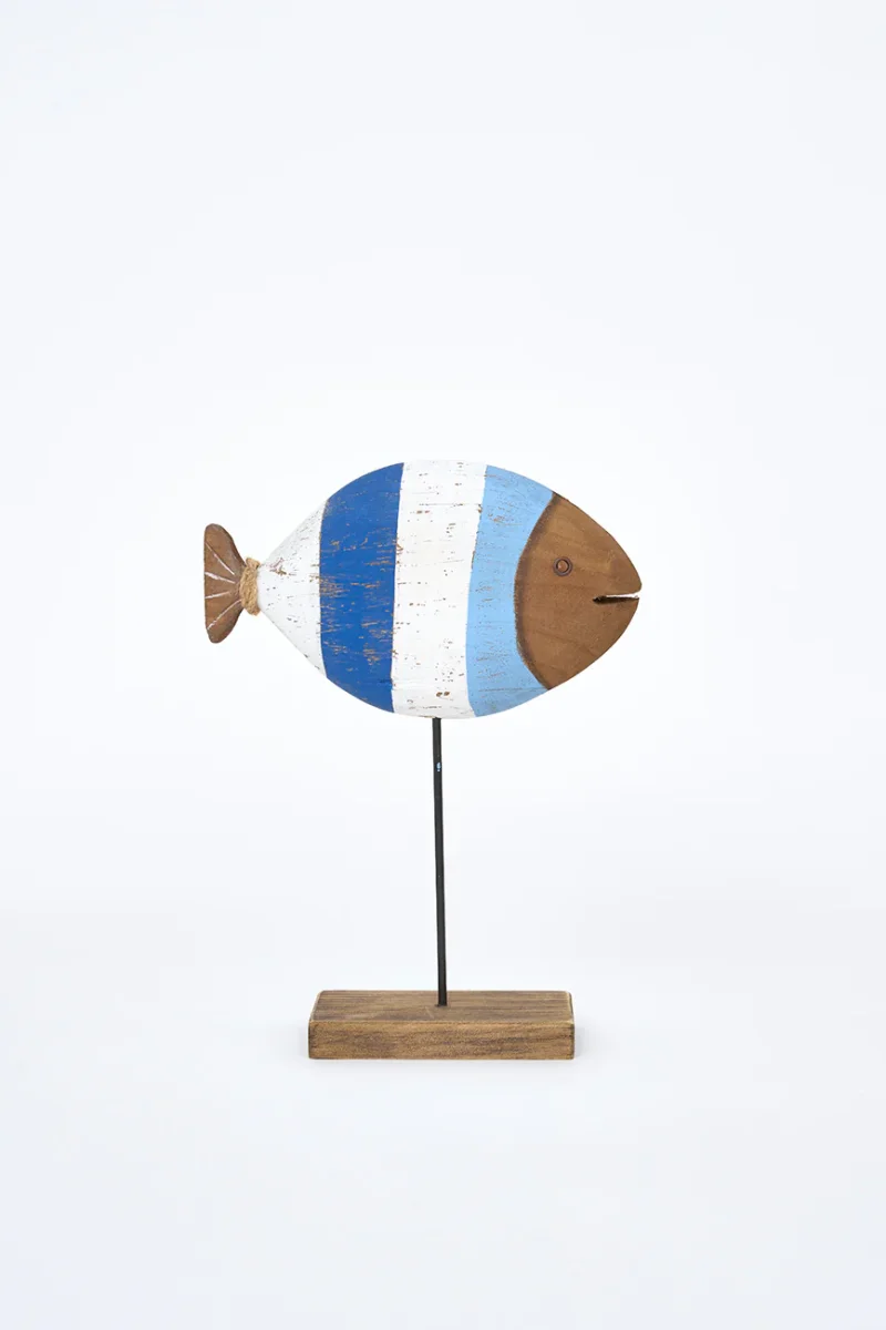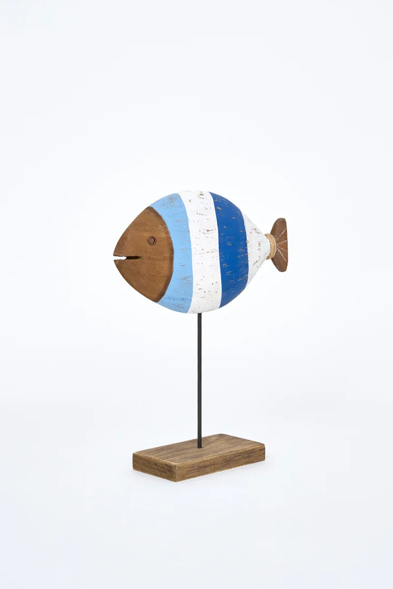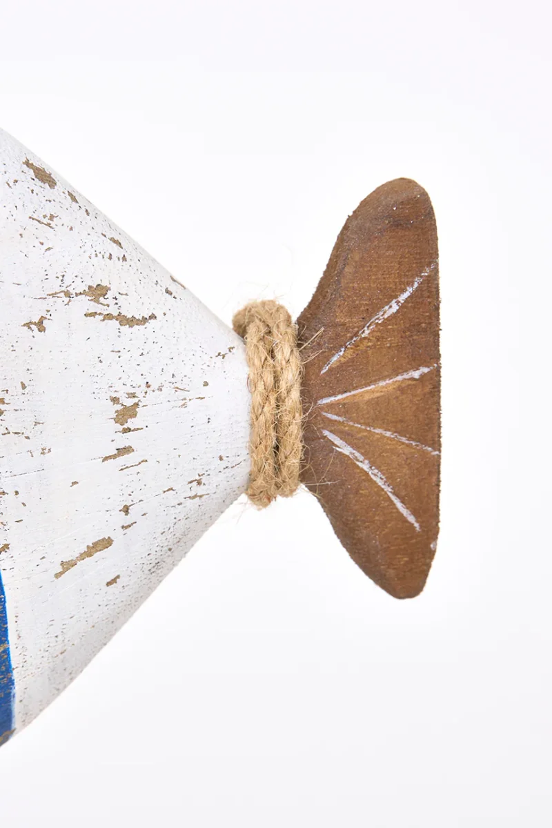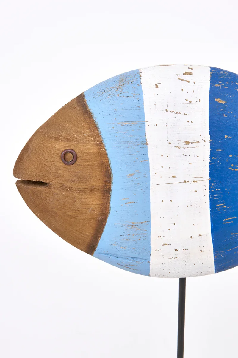 Pez decorativo elaborado en madera con base. Pintado a rayas en tonos azules y blancos con acabado envejecido. Sus colores y formas combinan con colgantes, ristras y portavelas de la misma colección.