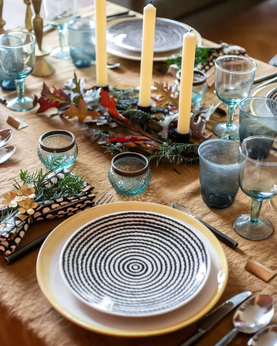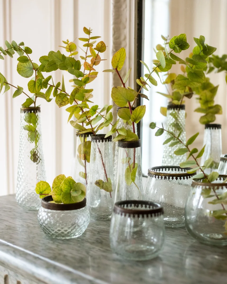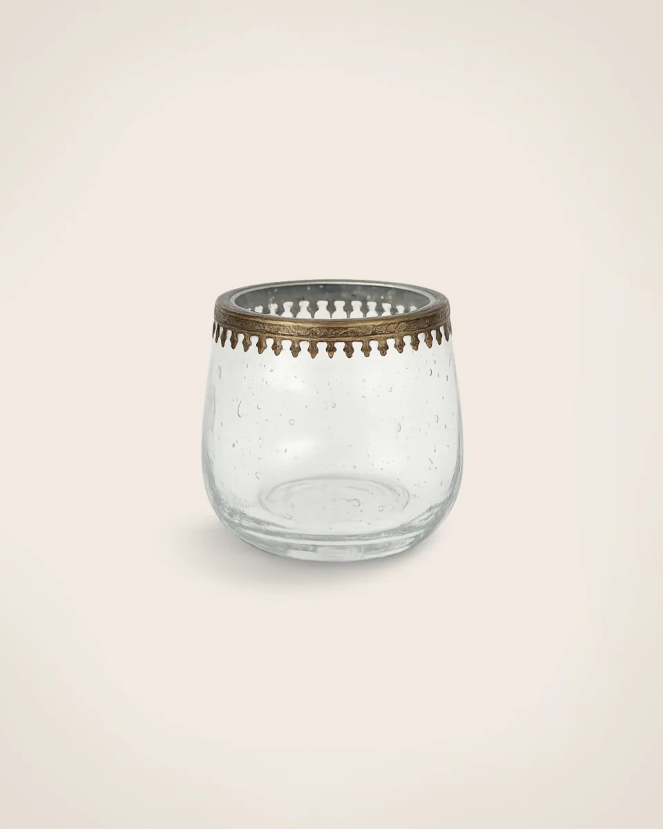 Le photophore Hera est entièrement soufflé à la bouche et façonné à la main à partir de verre recyclé. Ce procédé artisanal laisse apparaître de fines bulles, signature naturelle de la matière. Après le travail du verre, l’artisan vient sertir la pièce d’un anneau en laiton à motif dentelé, apportant une finition délicate et singulière. […]