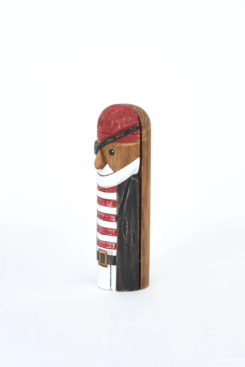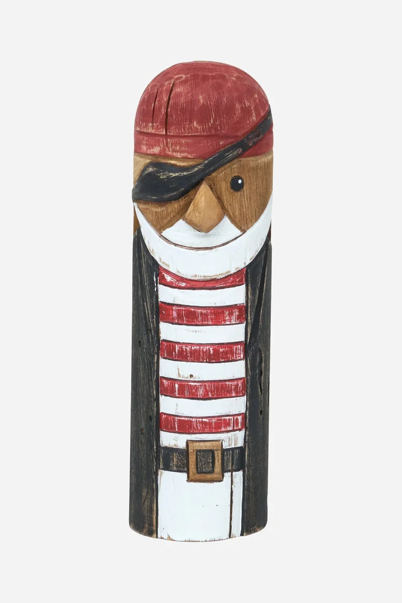 Pirata decorativo elaborado en madera con aspecto simpático. Lleva parche en el ojo y camiseta a rayas. Una figura decorativa con aire marinero y desenfadado.