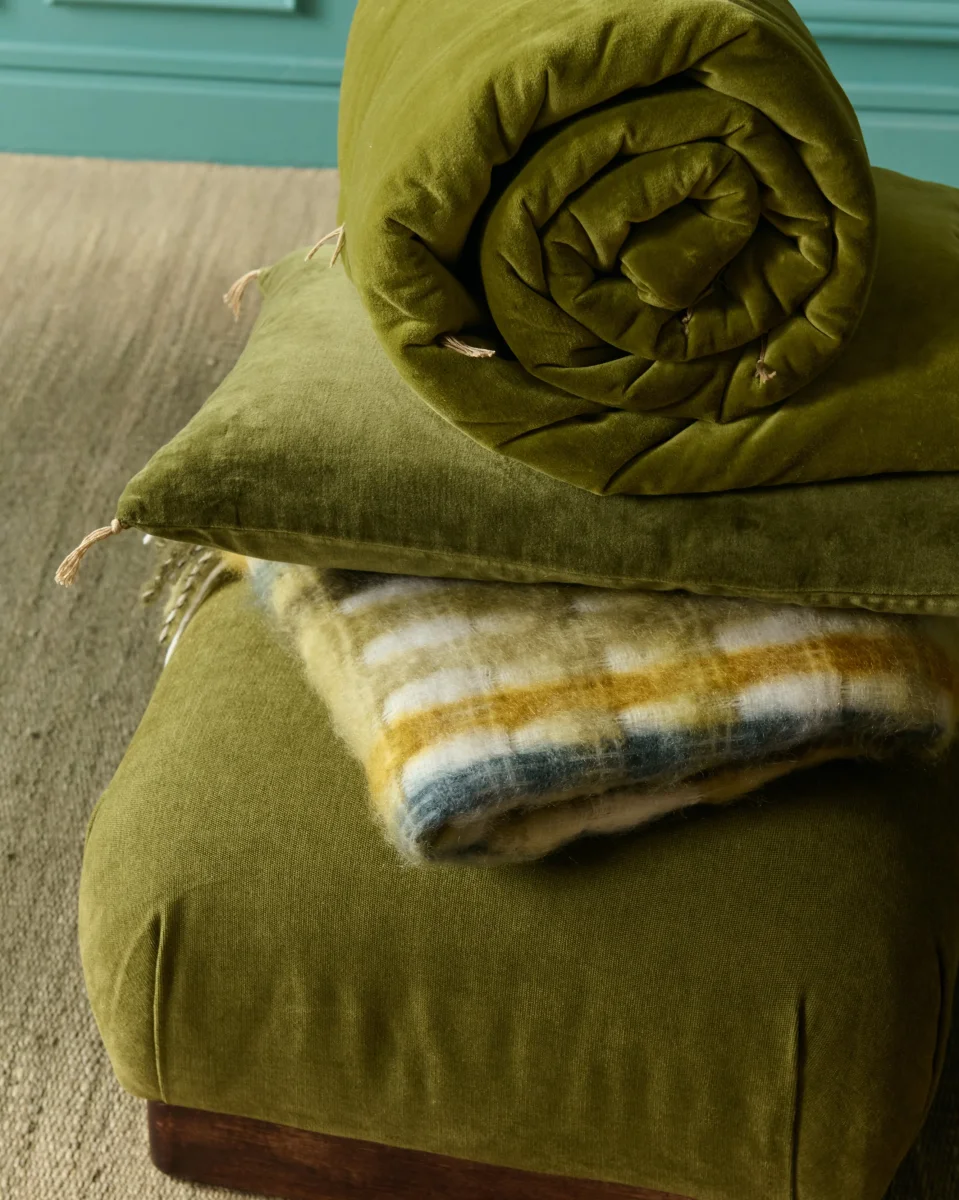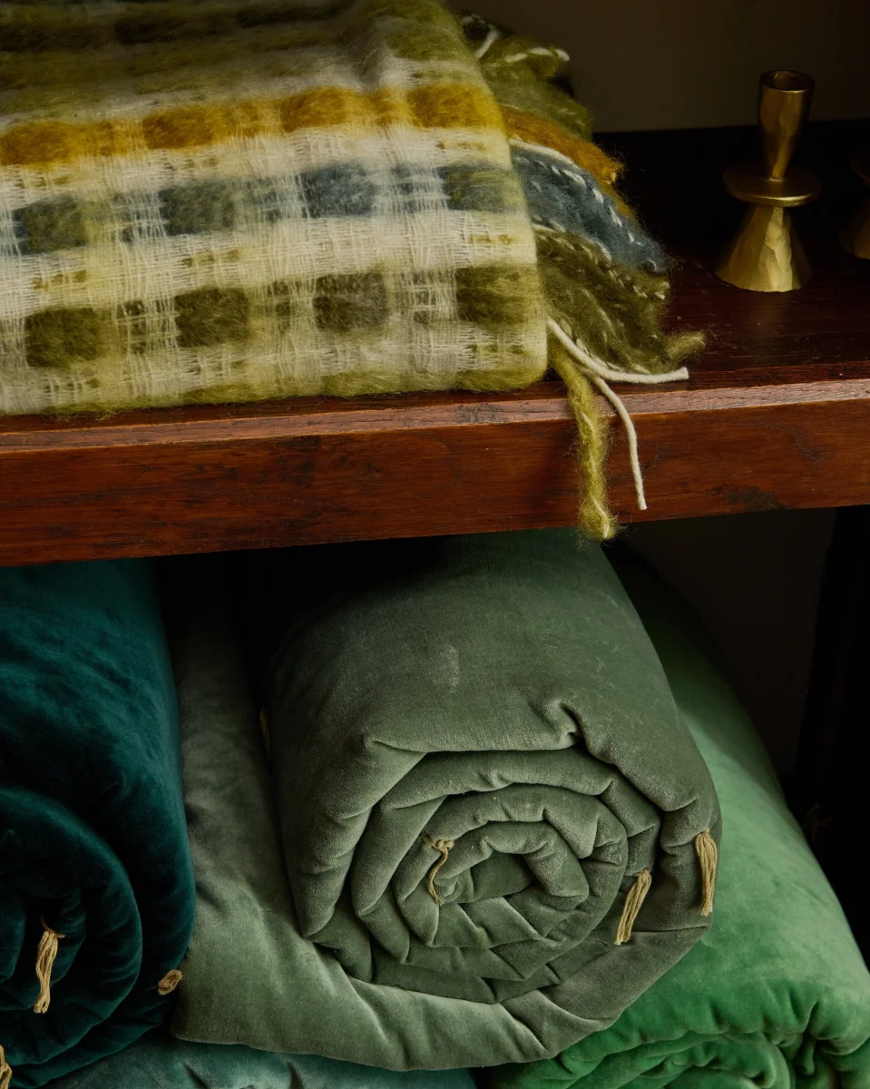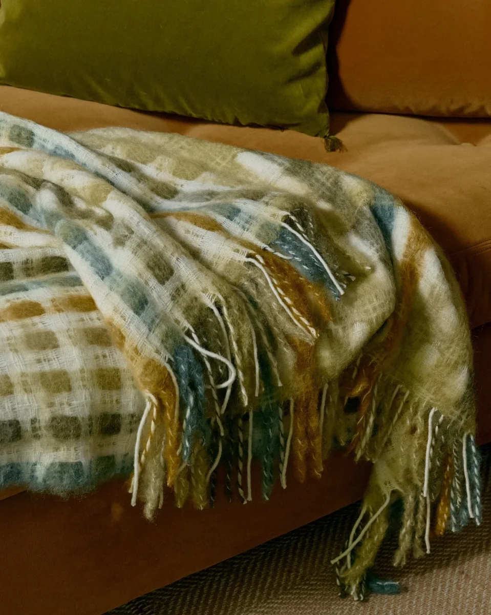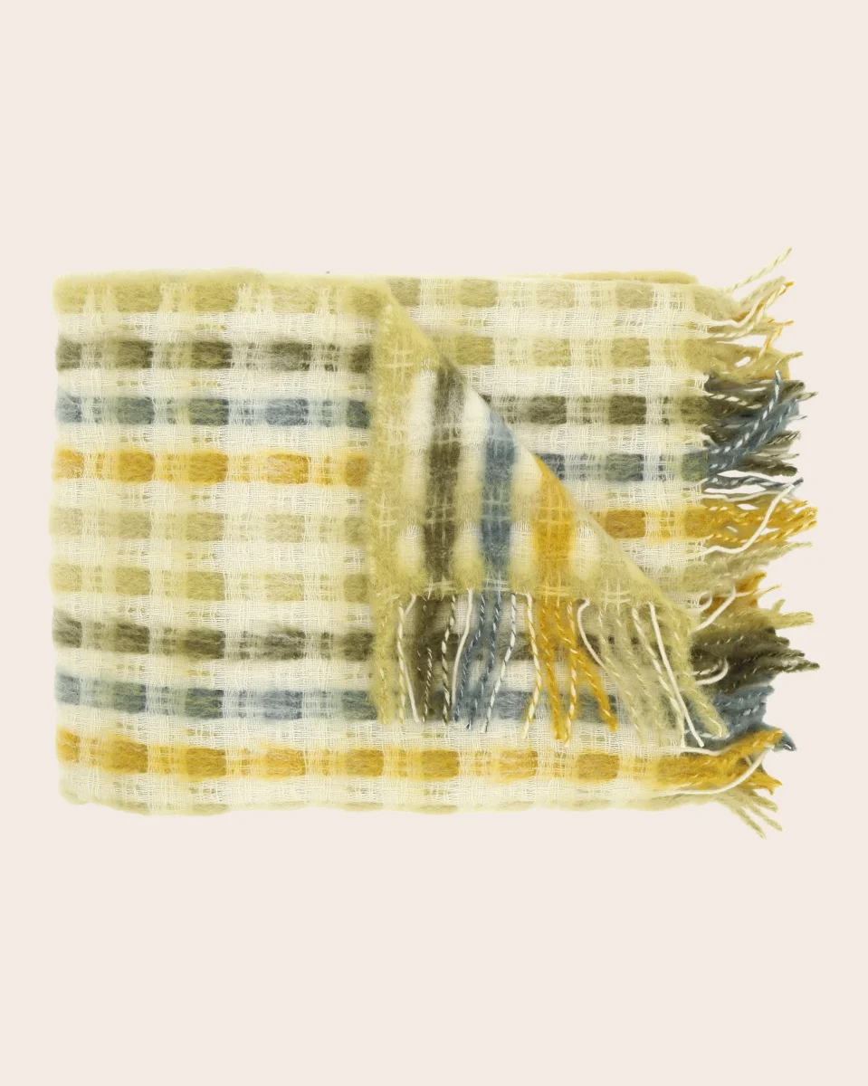 Ce plaid duveteux réchauffe par sa texture très douce et sa couleur ocrée. Composée de mohair et de mérinos, son tissage forme des carreaux légèrement flous. Tendresse, réconfort, chaleur… Et pour ne rien gâcher, une fabrication toute proche, en Espagne, par une entreprise engagée pour le bien-être animal et la préservation de l’environnement.