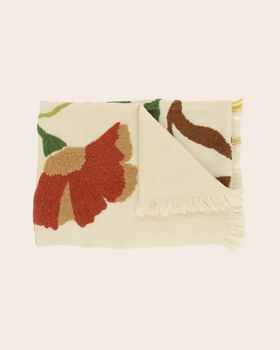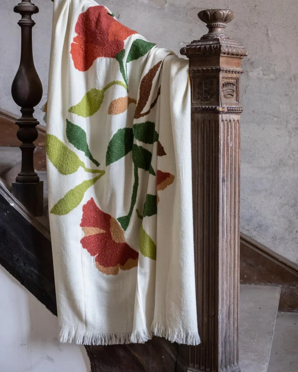 De grosses fleurs colorées étalent leurs pétales sur le fond crème Nipa, comme un herbier imaginaire qui aurait fait fleurir la laine.