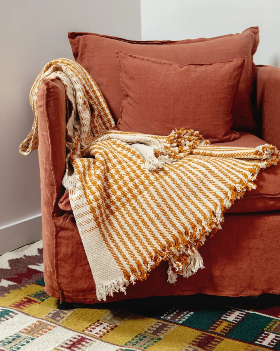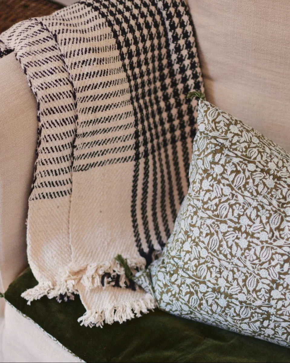 Le plaid Pied de poule est un pur khadi de coton : filé et tissé à la main. Cela apporte au tissage cette jolie irrégularité, qui le rend vivant et hypnotique.