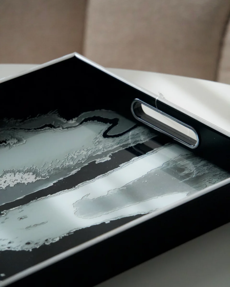 Sublimez votre intérieur avec ce plateau de service, une pièce maîtresse qui allie le luxe visuel du marbre à la légèreté des matériaux modernes. Son fond présente des motifs et des veinages complexes en noir, blanc et argent, imitant avec une précision saisissante l’esthétique du marbre naturel. Le contraste entre les nuances minérales et le cadre noir épuré apporte une touche contemporaine et chic à votre décoration.