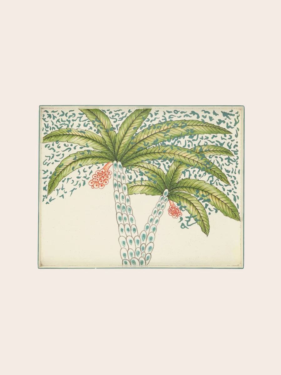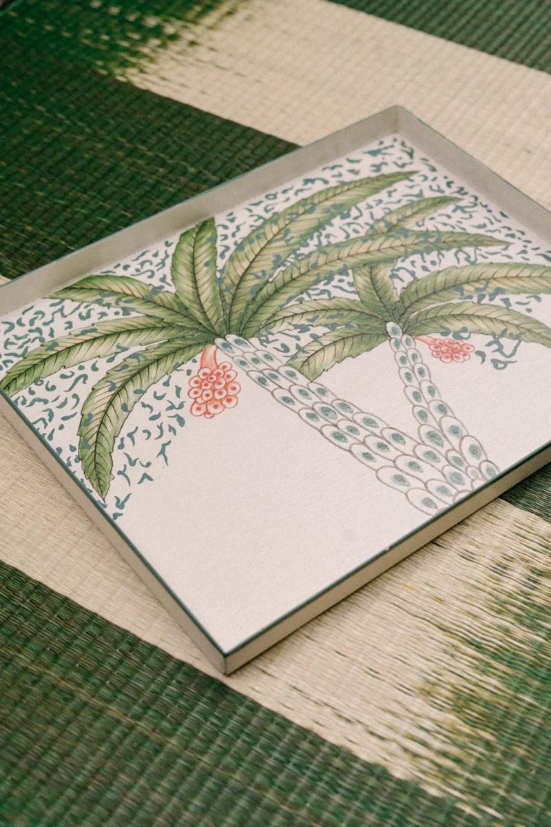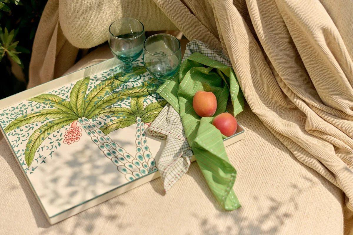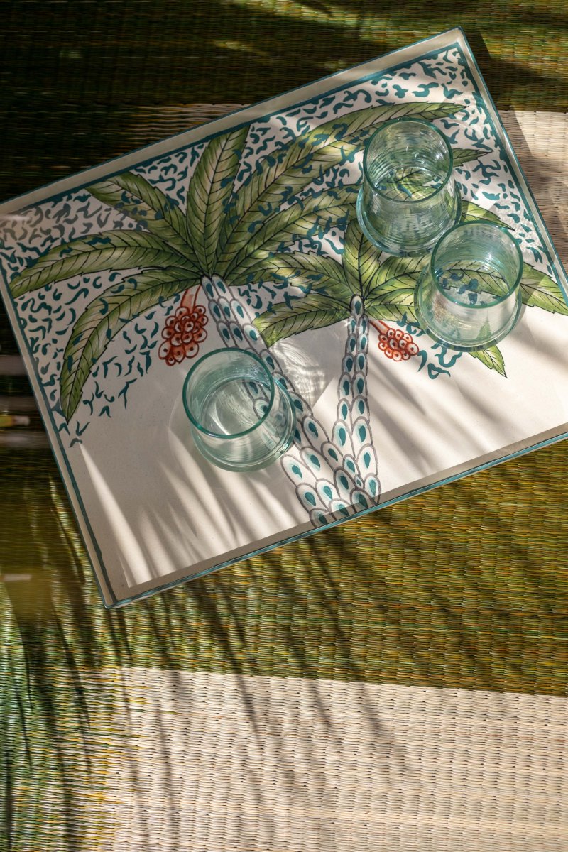Le beau motif palmier du plateau Kochi cache une technique minutieuse : la plaque de métal aux lignes épurées est recouverte d’une pièce de lin par l’artisan avant d’être peinte patiemment à la main. Le motif naît ainsi sous son pinceau habile. Tout en teintes oasis, le plateau Kochi joue les verts et naturels, relevés […]