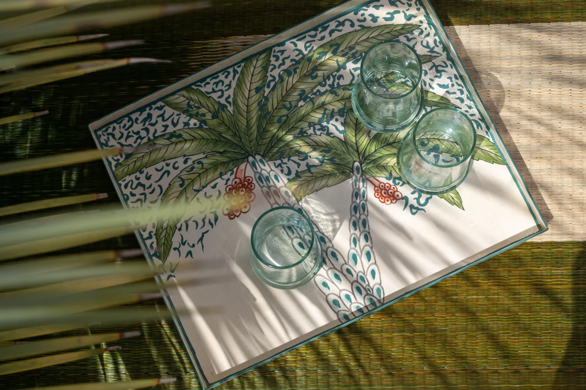 Le beau motif palmier du plateau Kochi cache une technique minutieuse : la plaque de métal aux lignes épurées est recouverte d’une pièce de lin par l’artisan avant d’être peinte patiemment à la main. Le motif naît ainsi sous son pinceau habile.