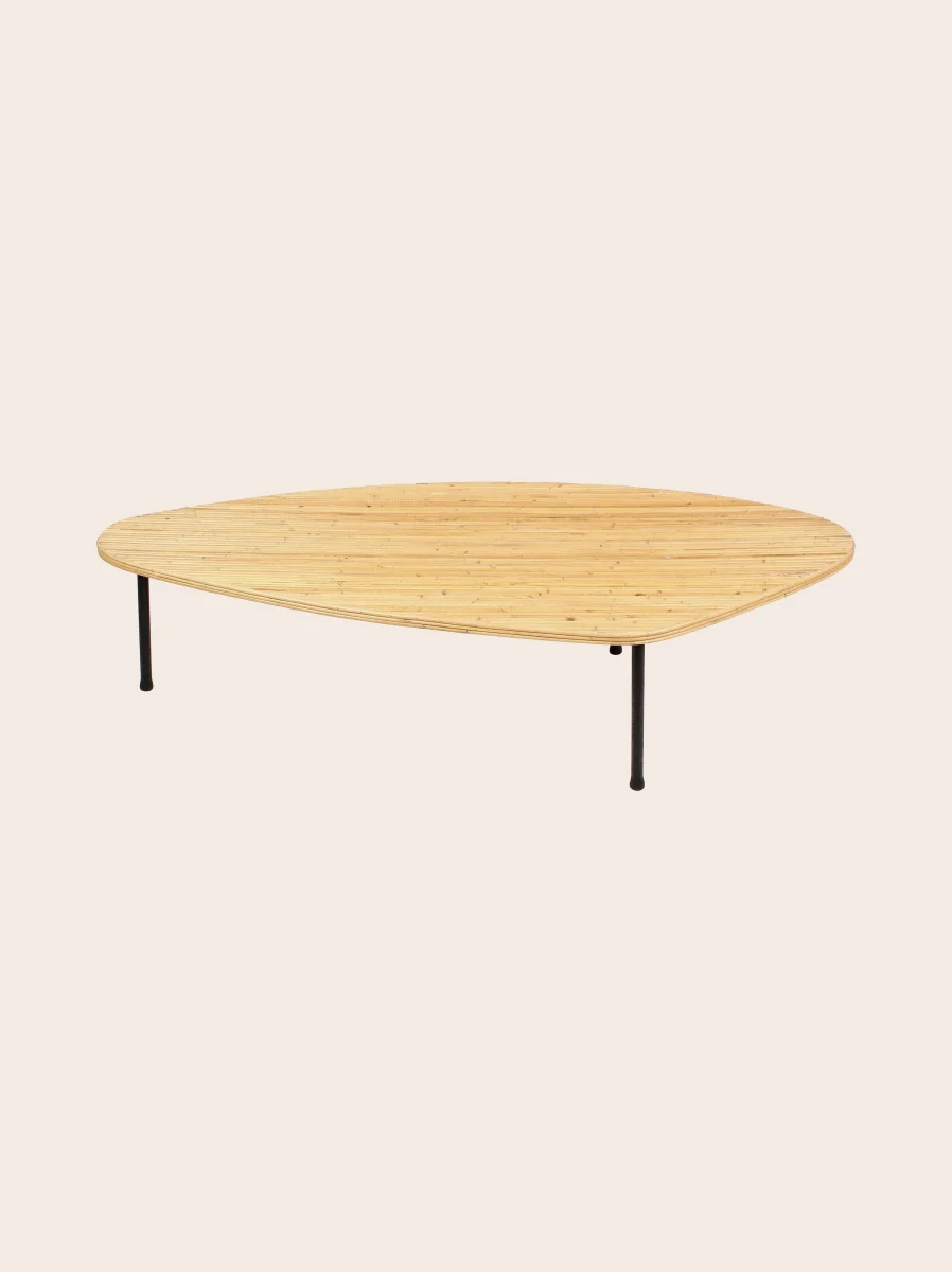 L’intemporelle table Yomi se décline : un plateau de bambou, décliné en 3 tailles et différentes hauteurs de pieds, en acier martelé. Chaque pièce est le fruit d’un travail artisanal, long et minutieux : de fines sections de bambous sont assemblées et ajustées à la forme organique et irrégulière du plateau.