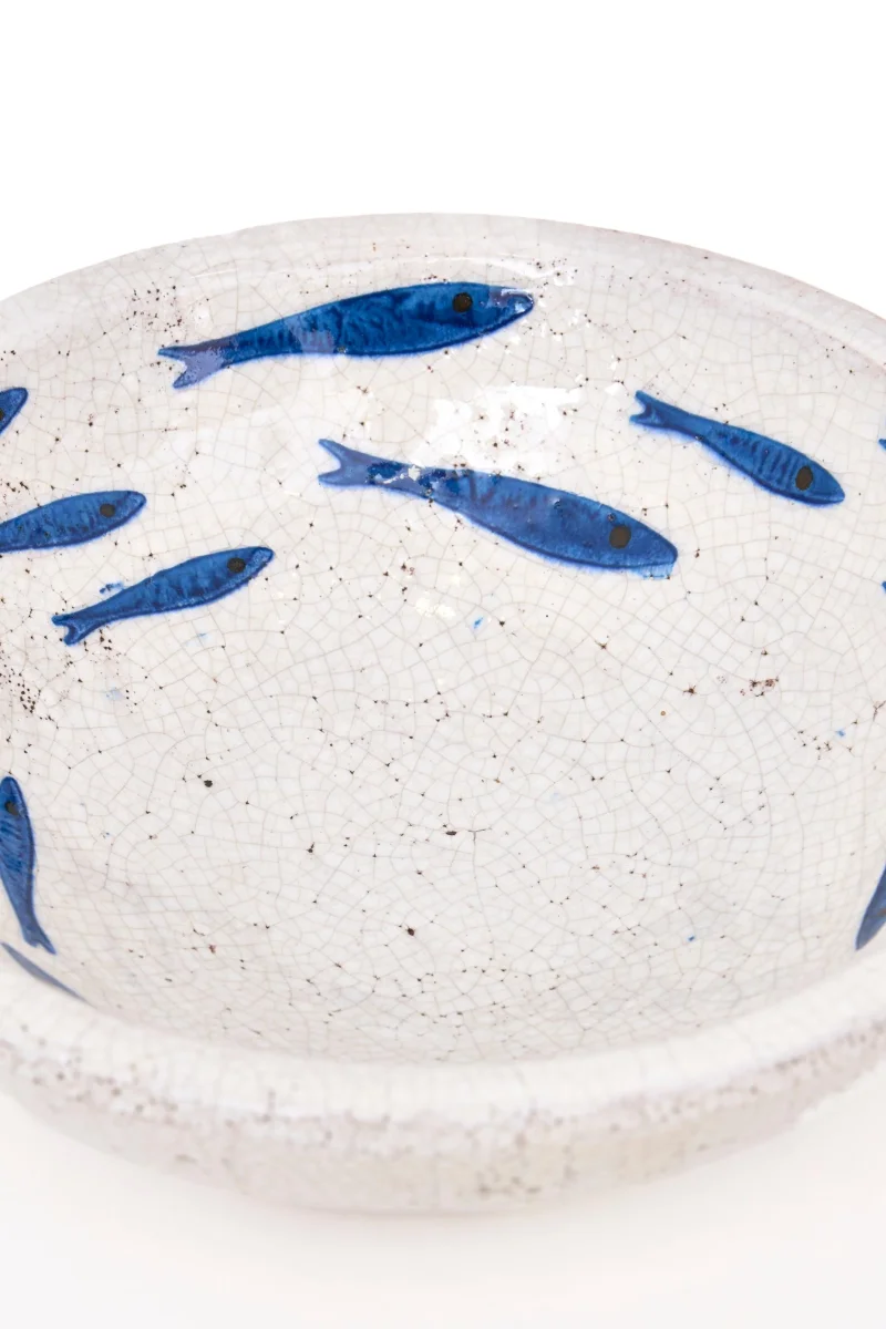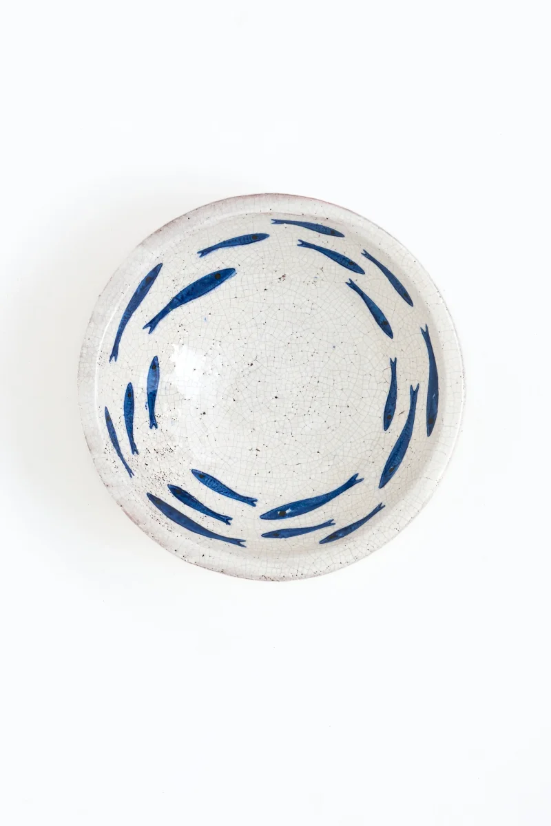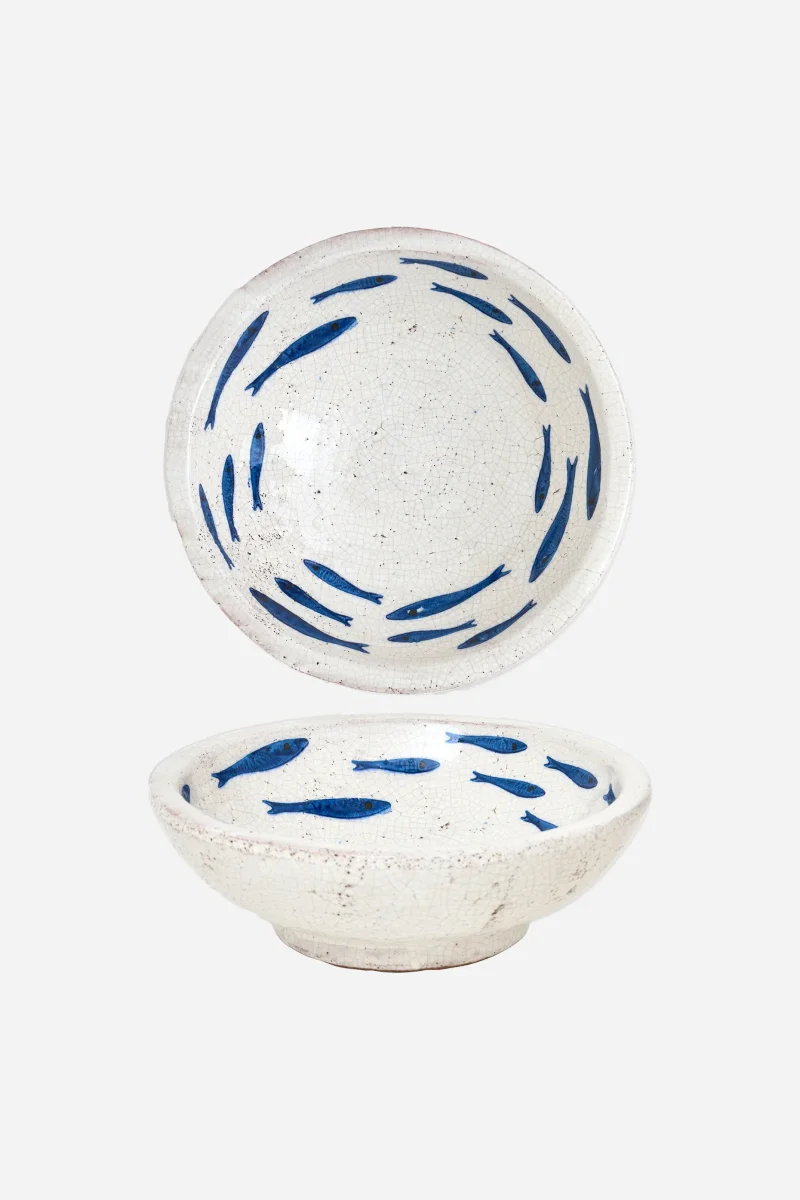 Plato de terracota con diseño de peces en azul aplicado en el interior y acabado craquelado. Una pieza decorativa de estilo costero que aporta personalidad y un toque artesanal a la mesa.