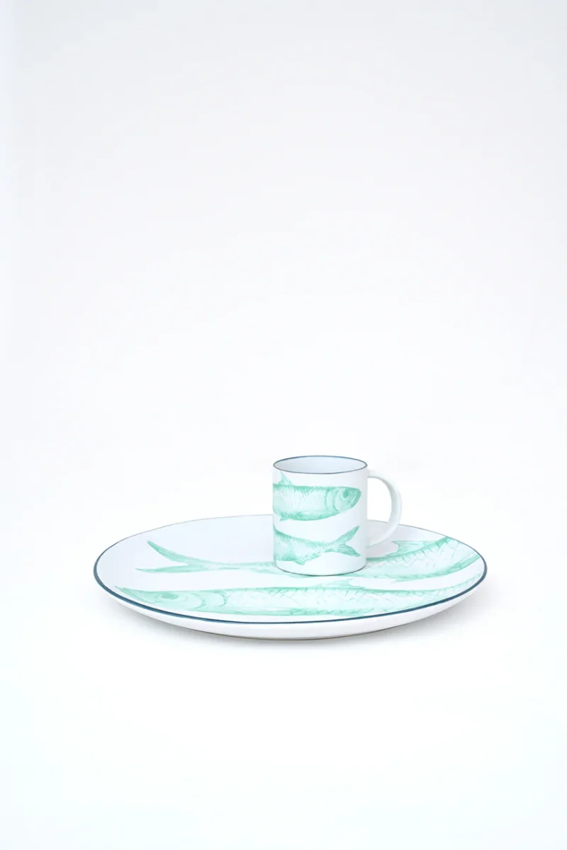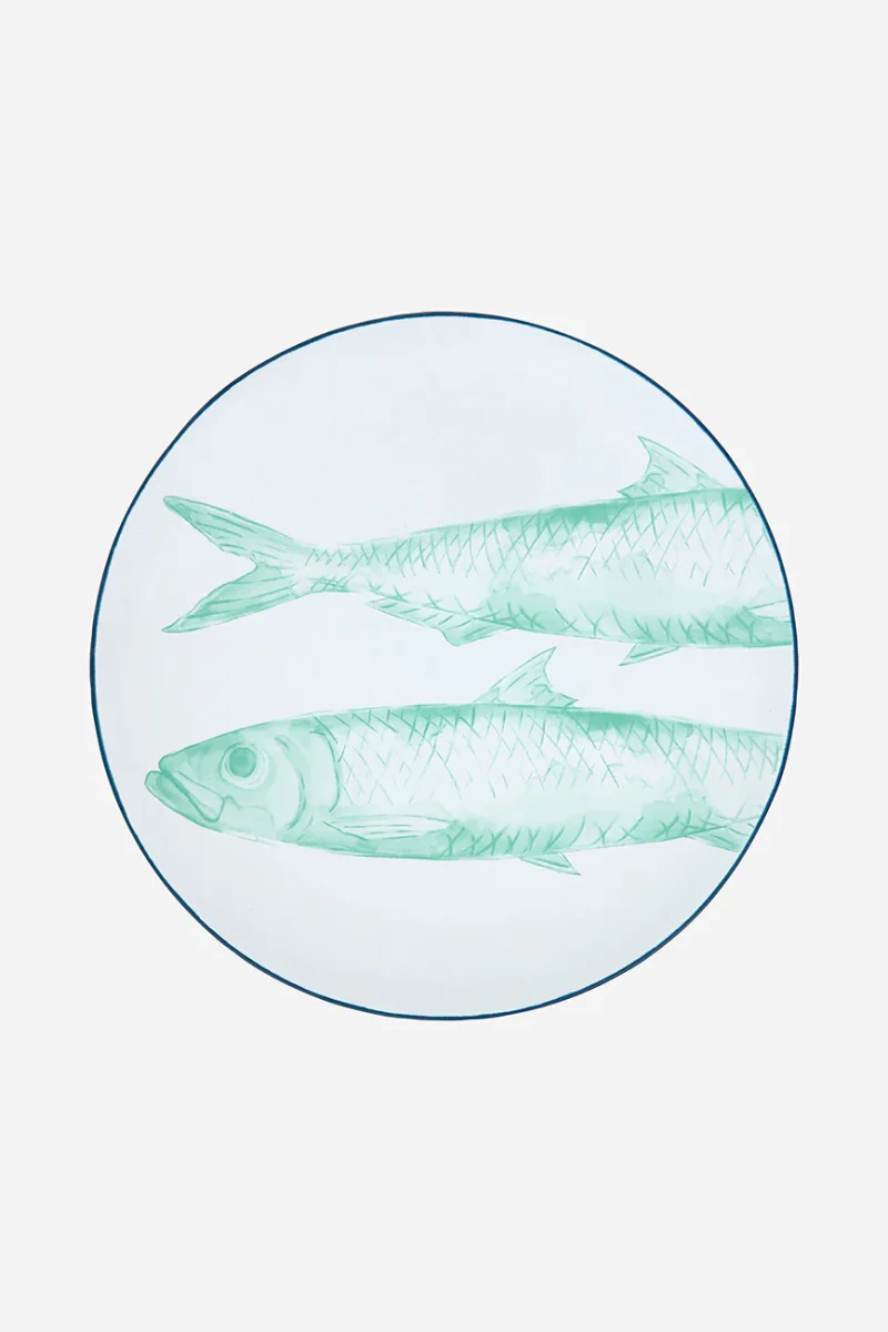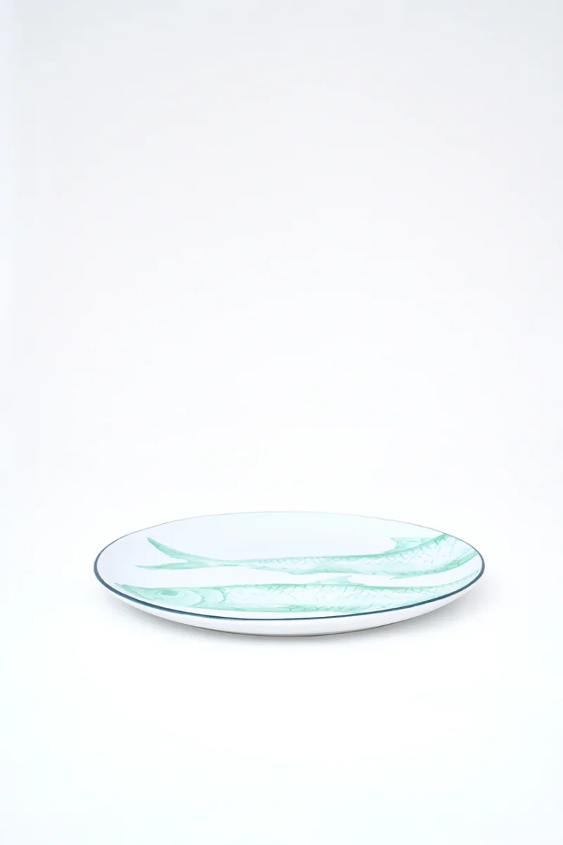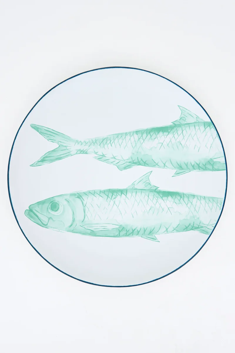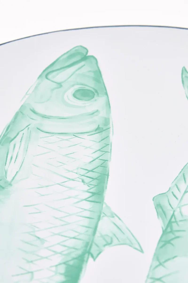 Plato grande elaborado en gres con peces pintados. Puede utilizarse para servir alimentos o como elemento decorativo. Una pieza funcional y decorativa con inspiración marinera.