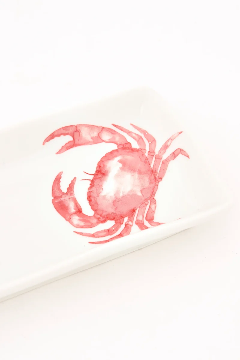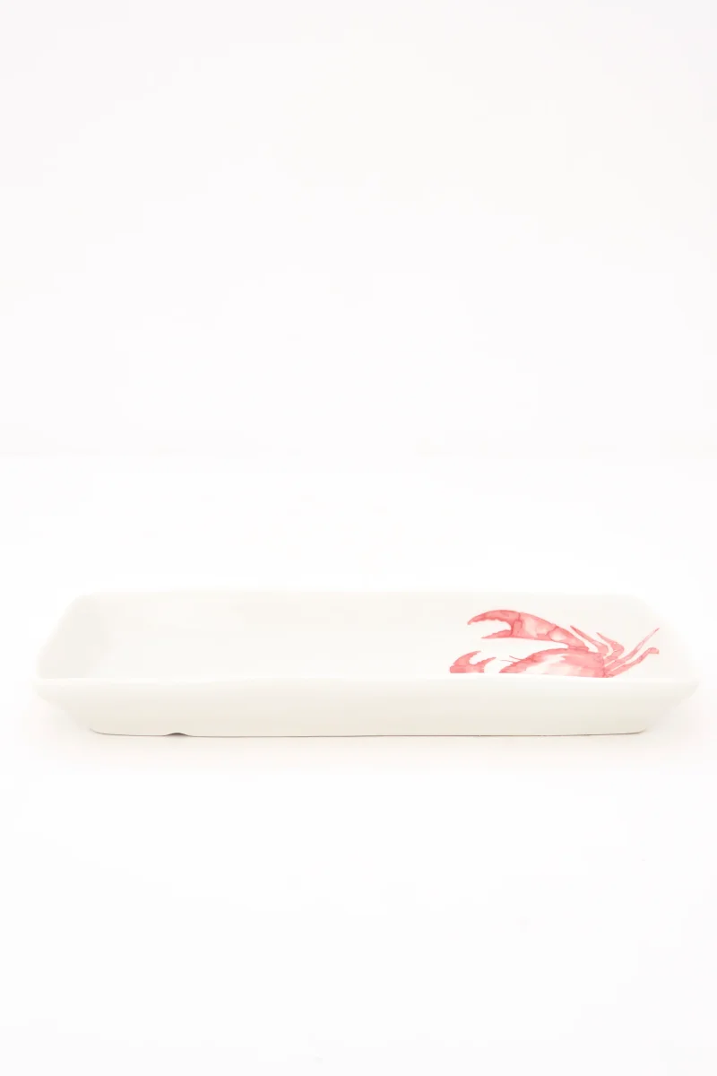 Plato de forma rectangular decorado con cangrejos pintados en color rojo.