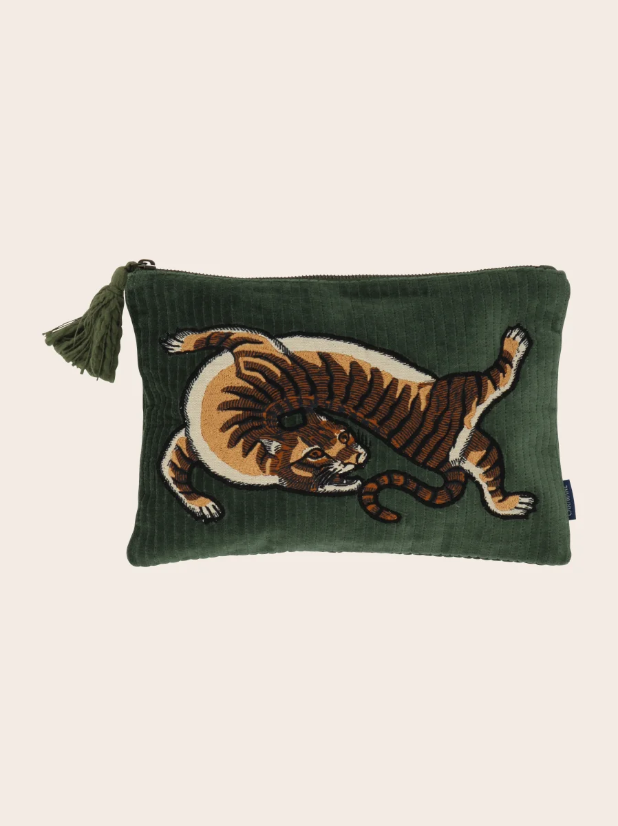 Nomade et précieuse, cette pochette accompagne chaque voyage comme un talisman. Brodée d’un tigre – symbole de force et de protection – elle mêle savoir-faire et douceur d’un velours de coton lavé. Chaque pièce est artisanale, brodée à la main. Cette pochette se nettoie uniquement à sec. Ne pas blanchir, sécher au tambour ou repasser.