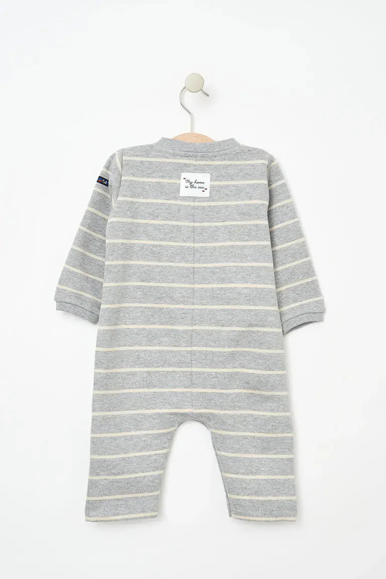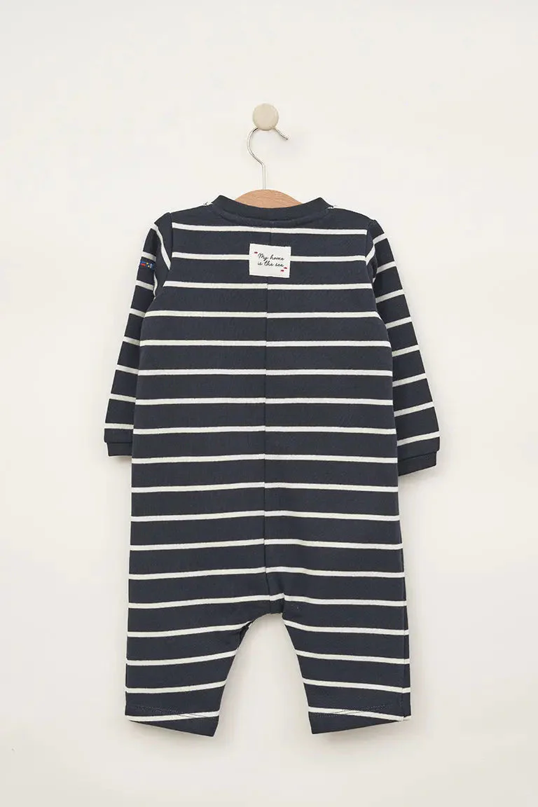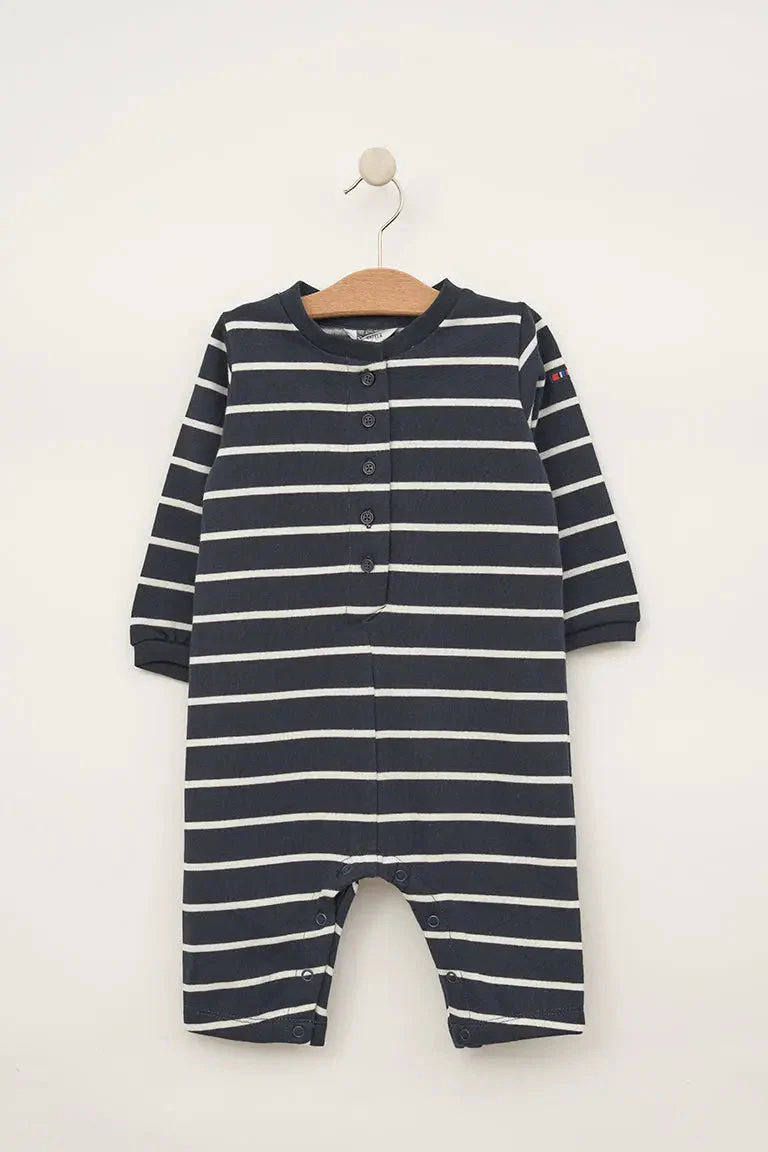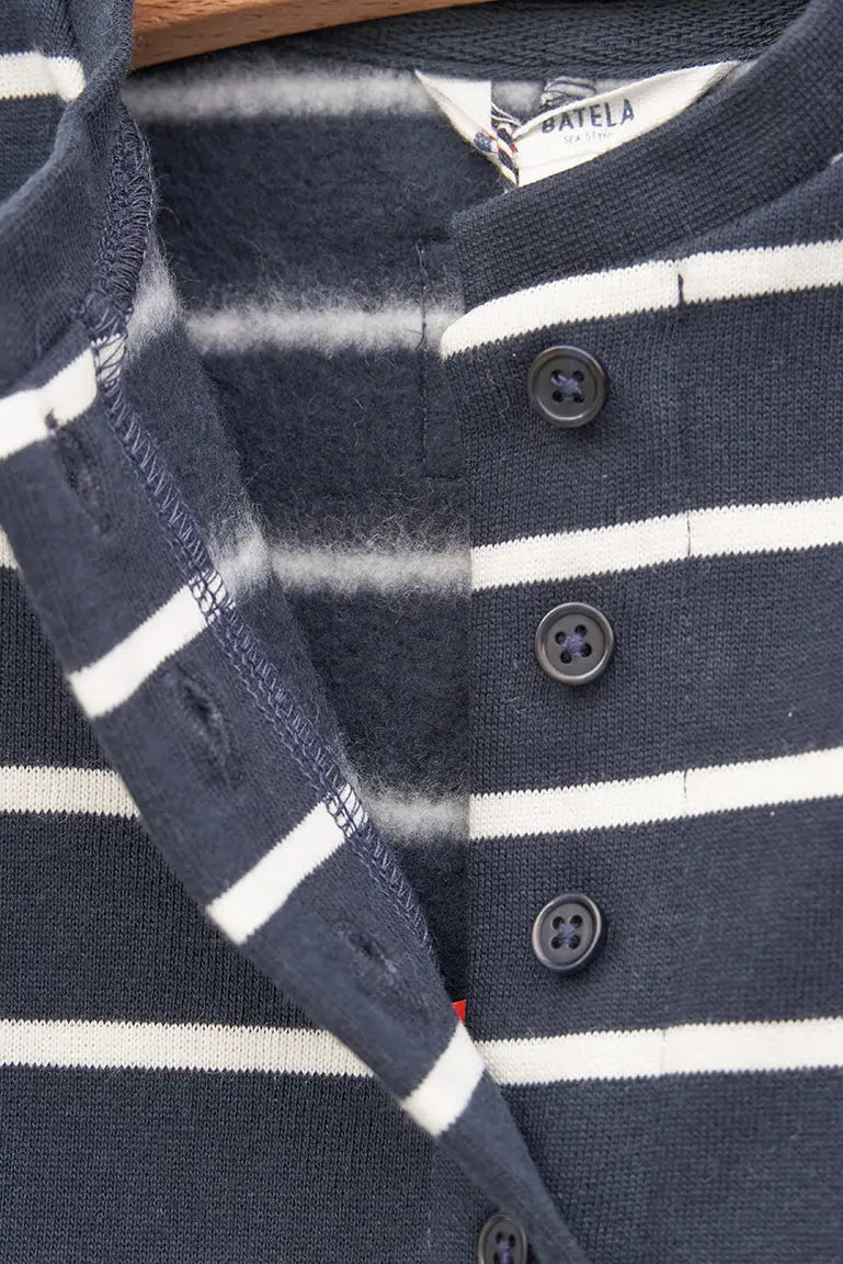 Ranita o body a rayas de estilo marinero con tejido Terry 100% algodón. El algodón es de 320 gramos lo que le confiere una calidad extra. Lleva una botonadura en la parte frontal de la prenda.