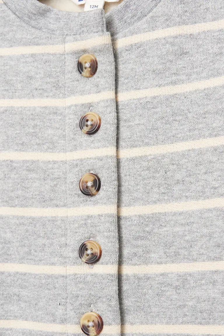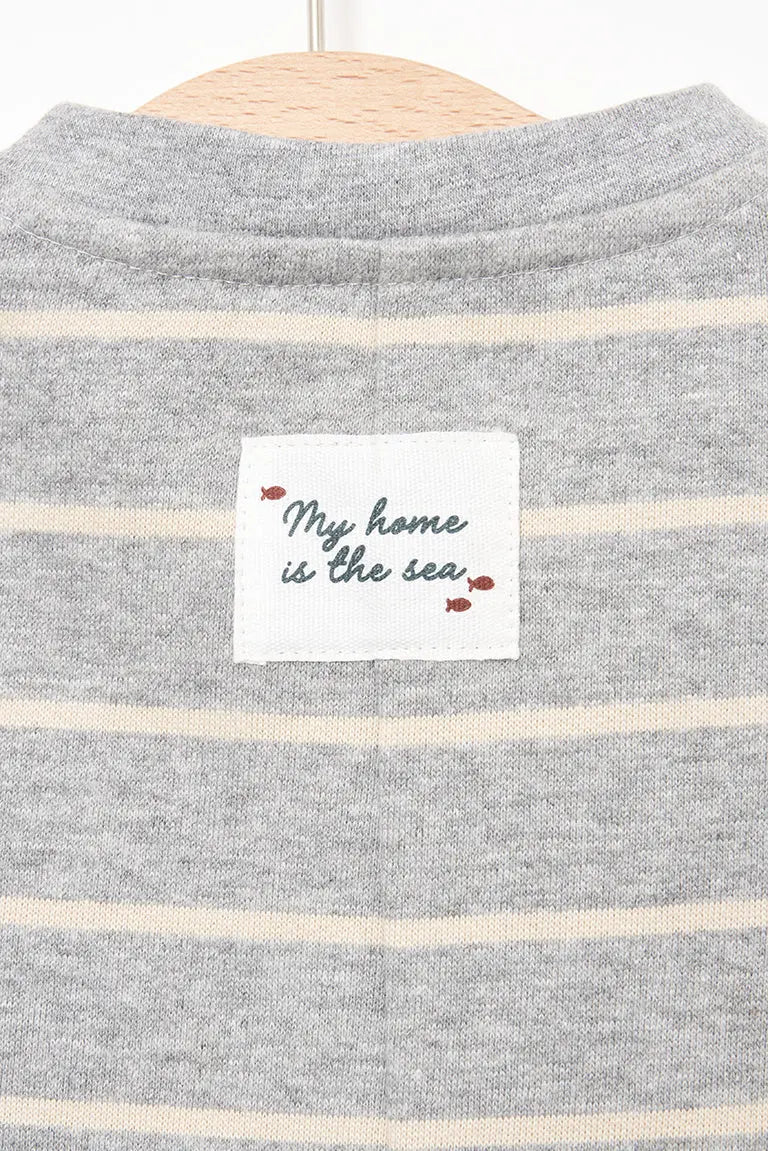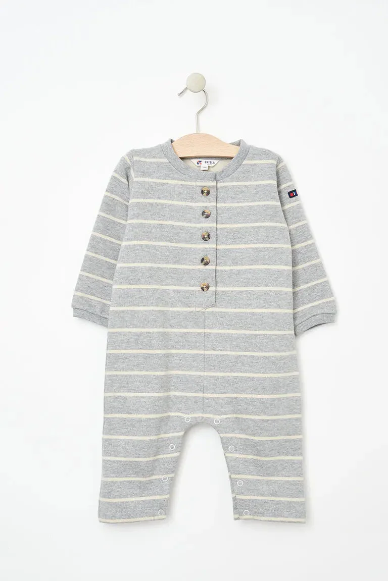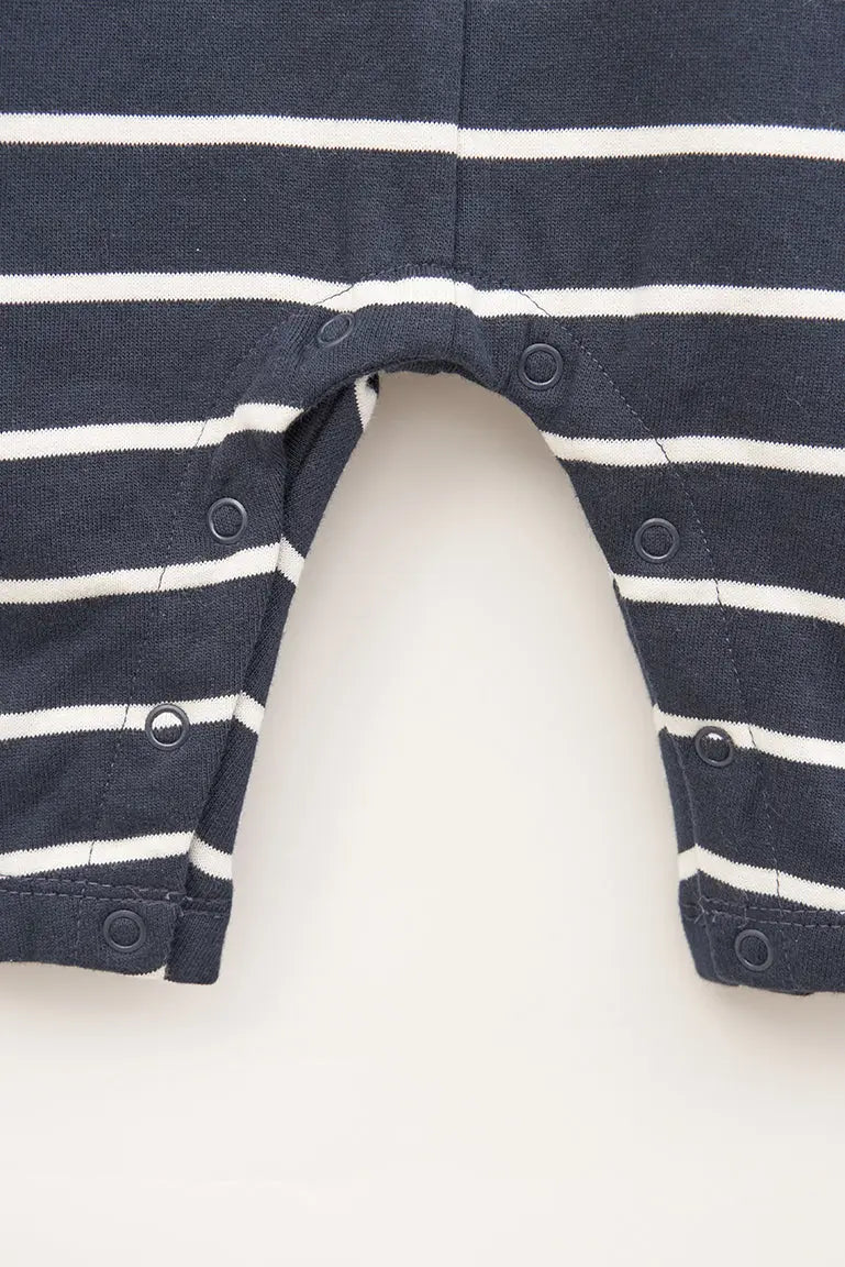 Ranita o body a rayas de estilo marinero con tejido Terry 100% algodón. El algodón es de 320 gramos lo que le confiere una calidad extra. Lleva una botonadura en la parte frontal de la prenda.