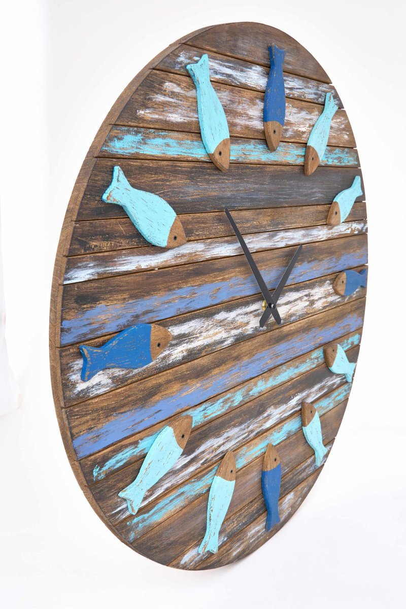 Reloj de pared de madera con acabado envejecido y peces decorativos en tonos azules. Una pieza funcional y decorativa que aporta un aire náutico y artesanal a cualquier estancia.