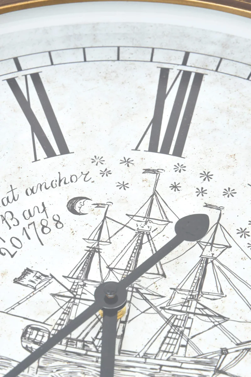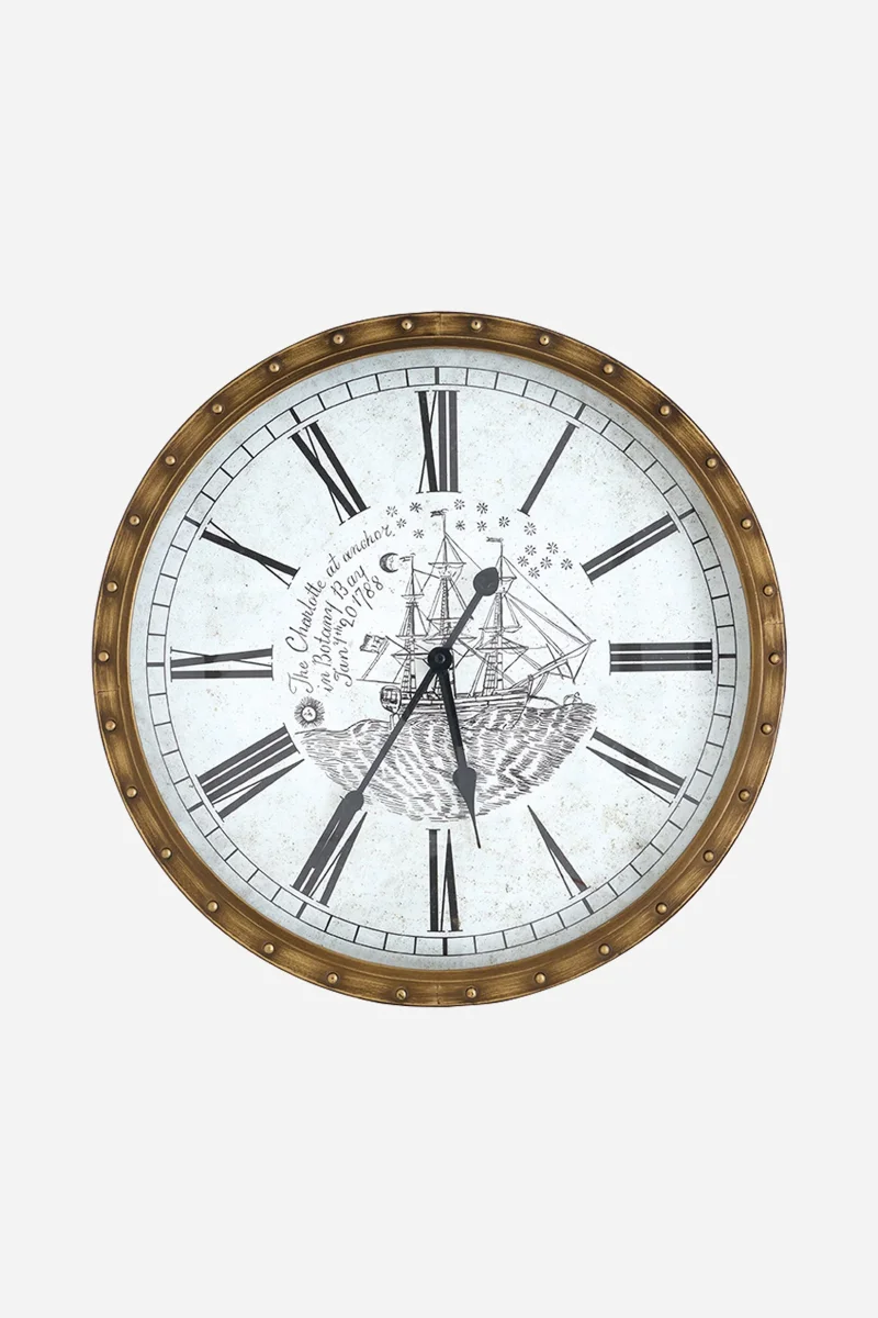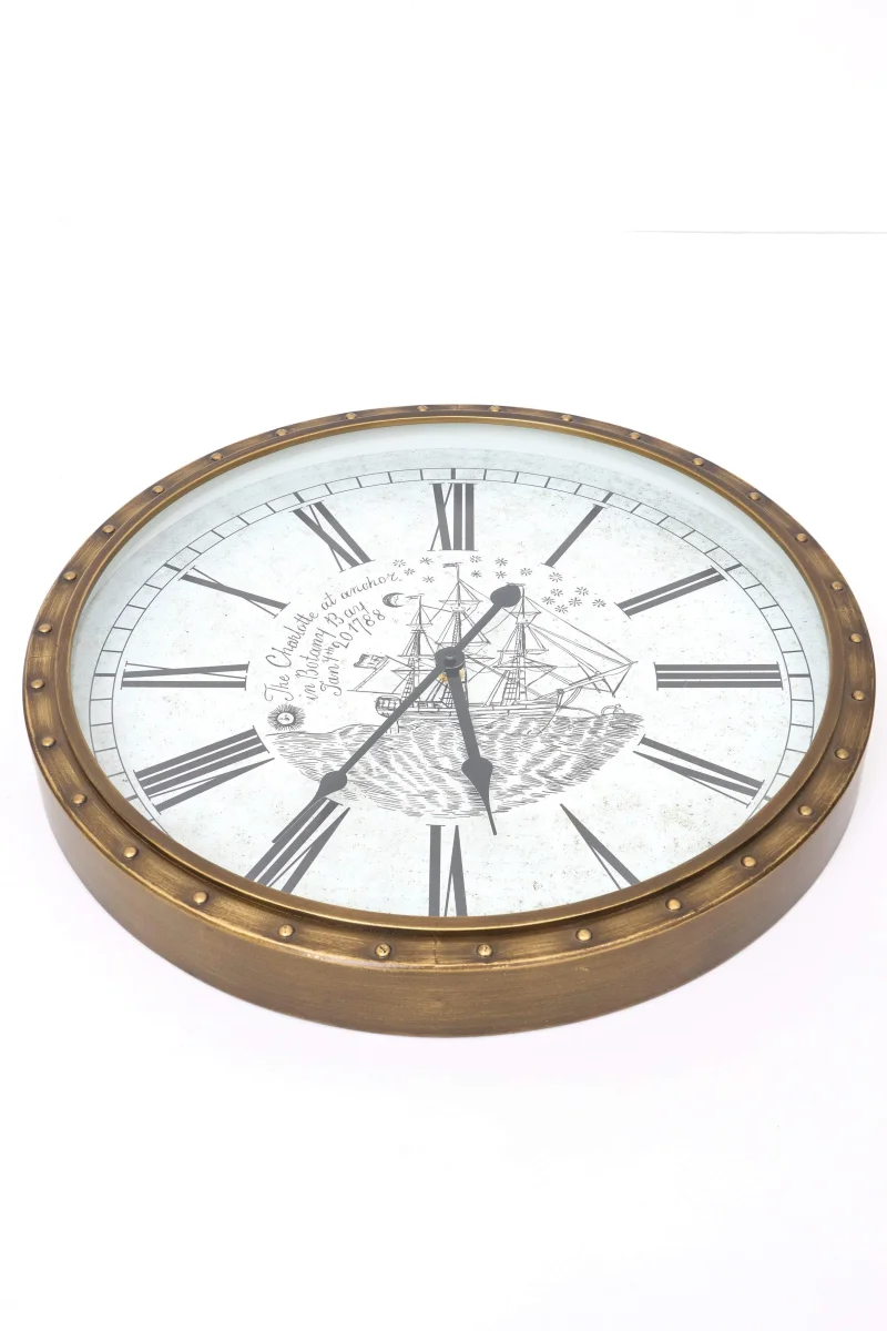 Reloj de pared fabricado en aluminio con marco efecto latón envejecido y esfera con numeración romana. Un diseño de inspiración marinera que aporta carácter y estilo clásico a cualquier estancia.