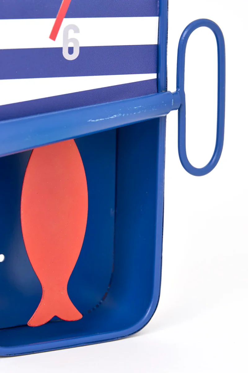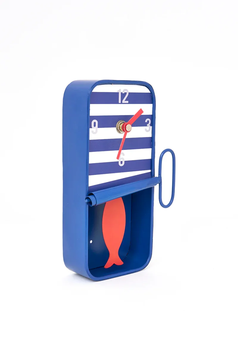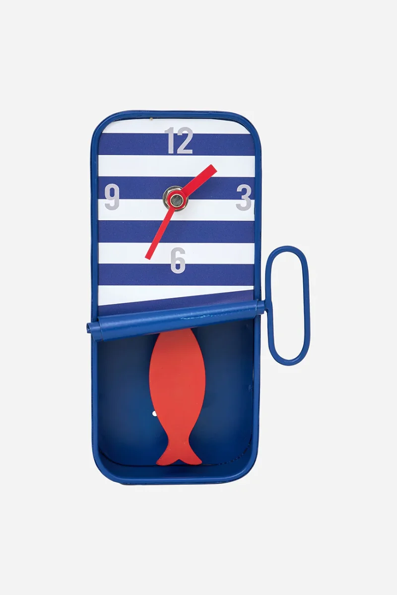 Reloj decorativo que simula una lata de conserva. La parte frontal presenta un diseño a rayas y un acabado semiabierto. En su interior incorpora un péndulo con forma de pez, visible como elemento decorativo.