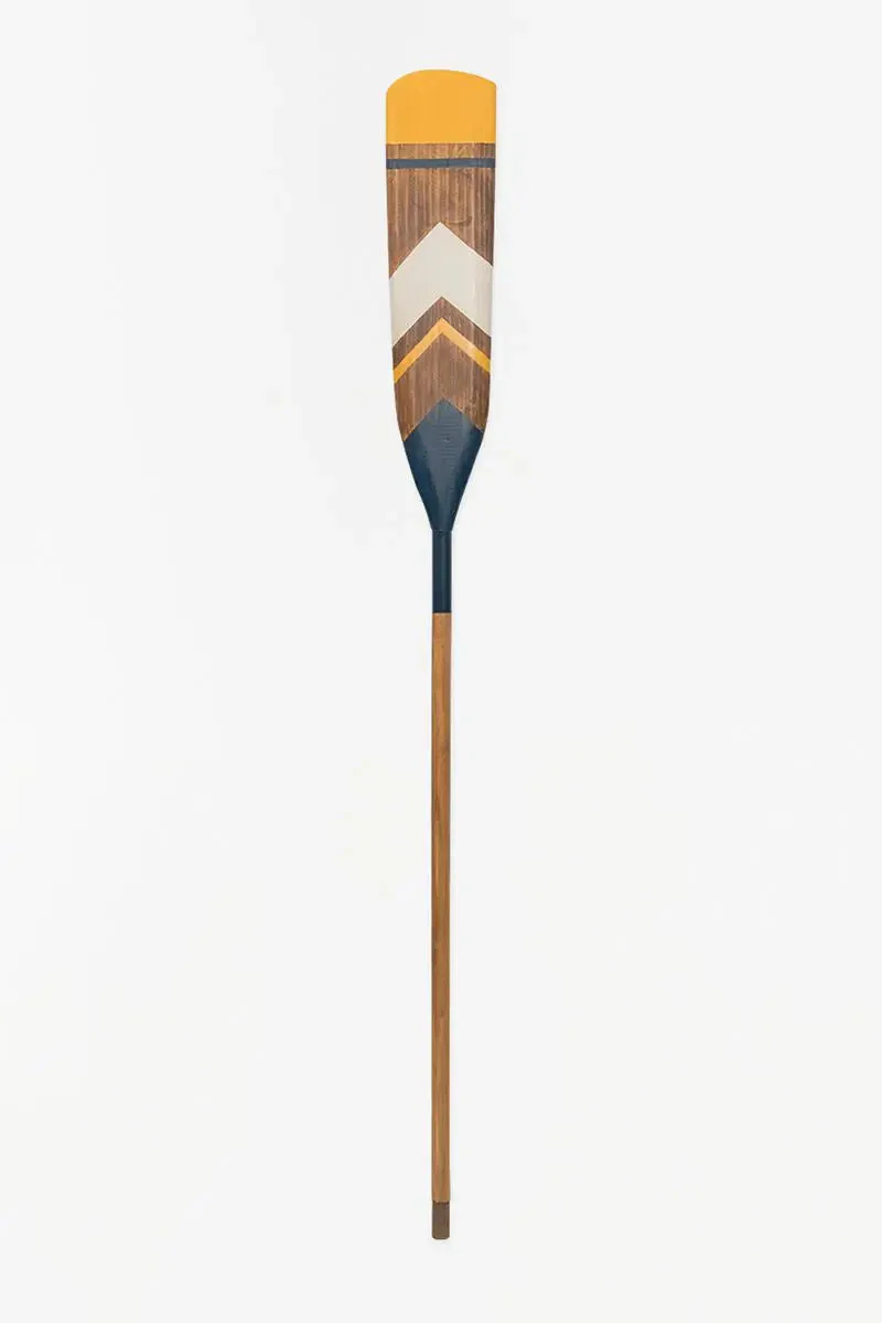 Remo de madera decorativo con la parte de la pala pintada en tres colores. Viene con dos cuerdas para colgarlo en la pared.