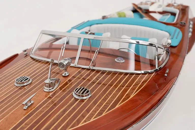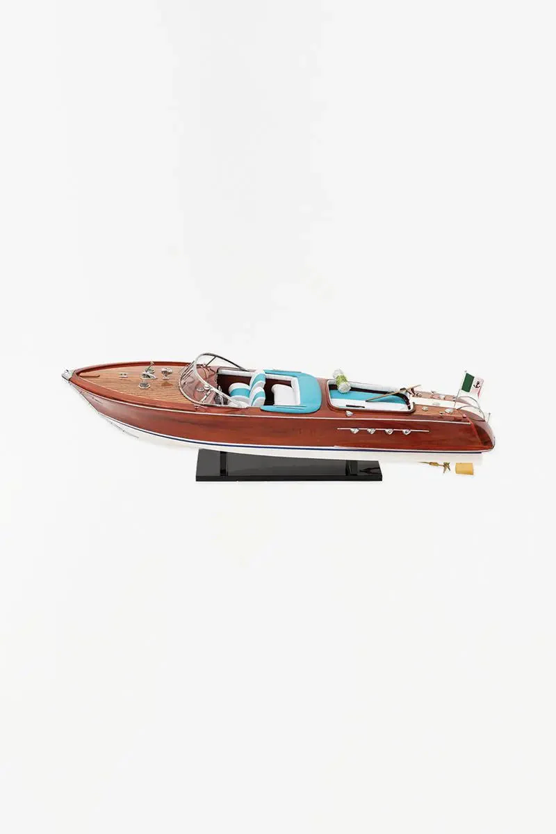 Réplica lancha motora de madera con asientos azules más pequeña que el modelo D0374. Materiales de alta calidad y un objeto marinero único para decorar tu hogar o negocio.