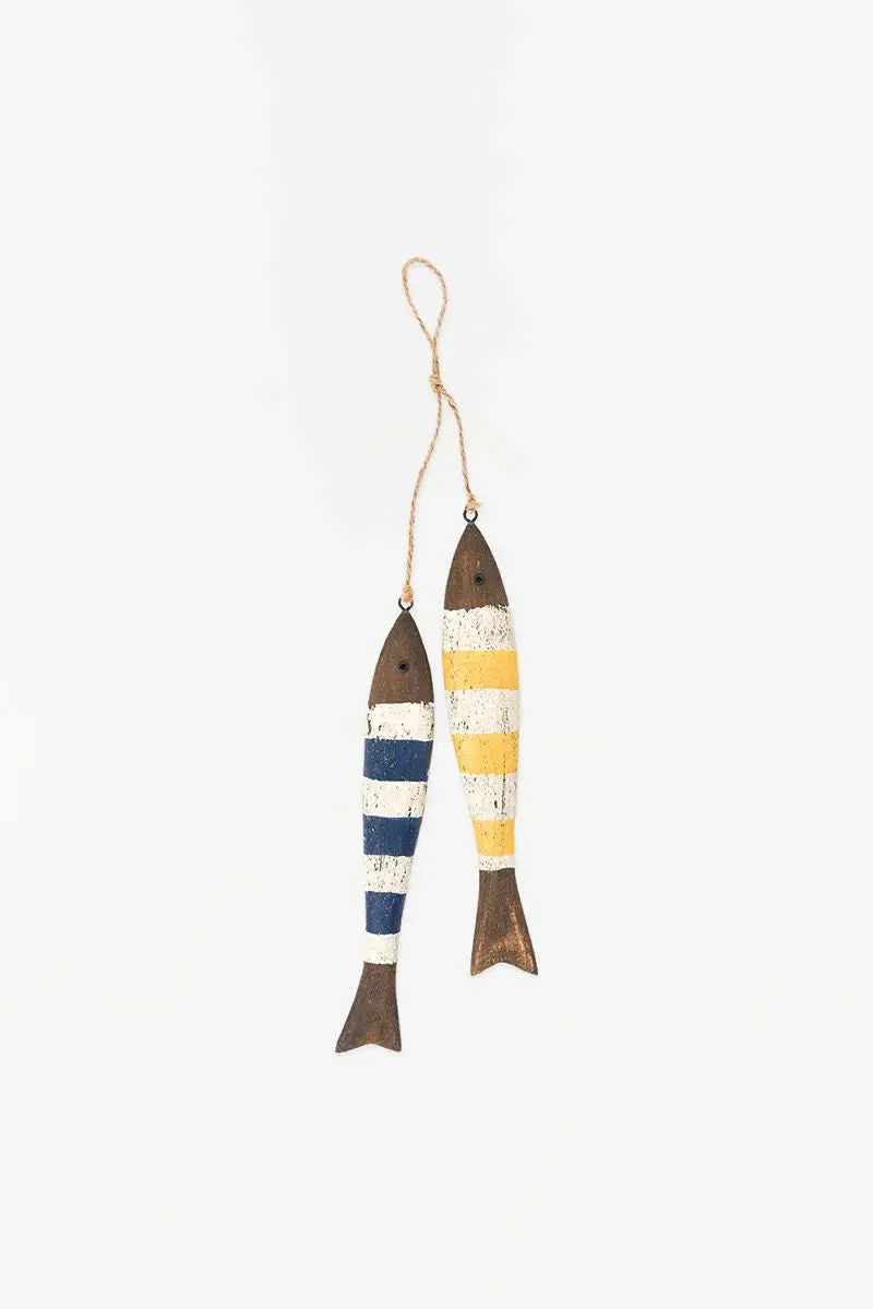 Ristra de dos peces de madera con cuerda para colgar. Rayas blancas, amarillas y azules. 20 cm El regalo marinero perfecto