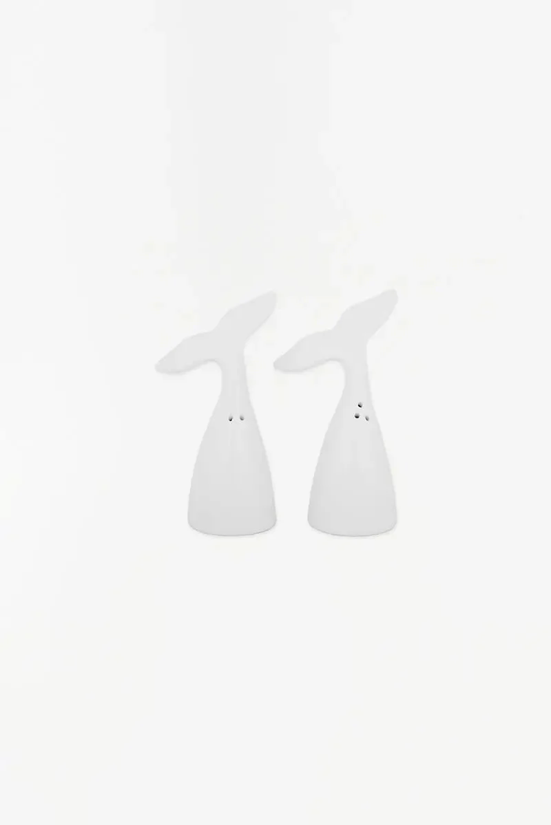 Set de salero y pimentero de cerámica con forma de ballena. Un detalle original para tu mesa.