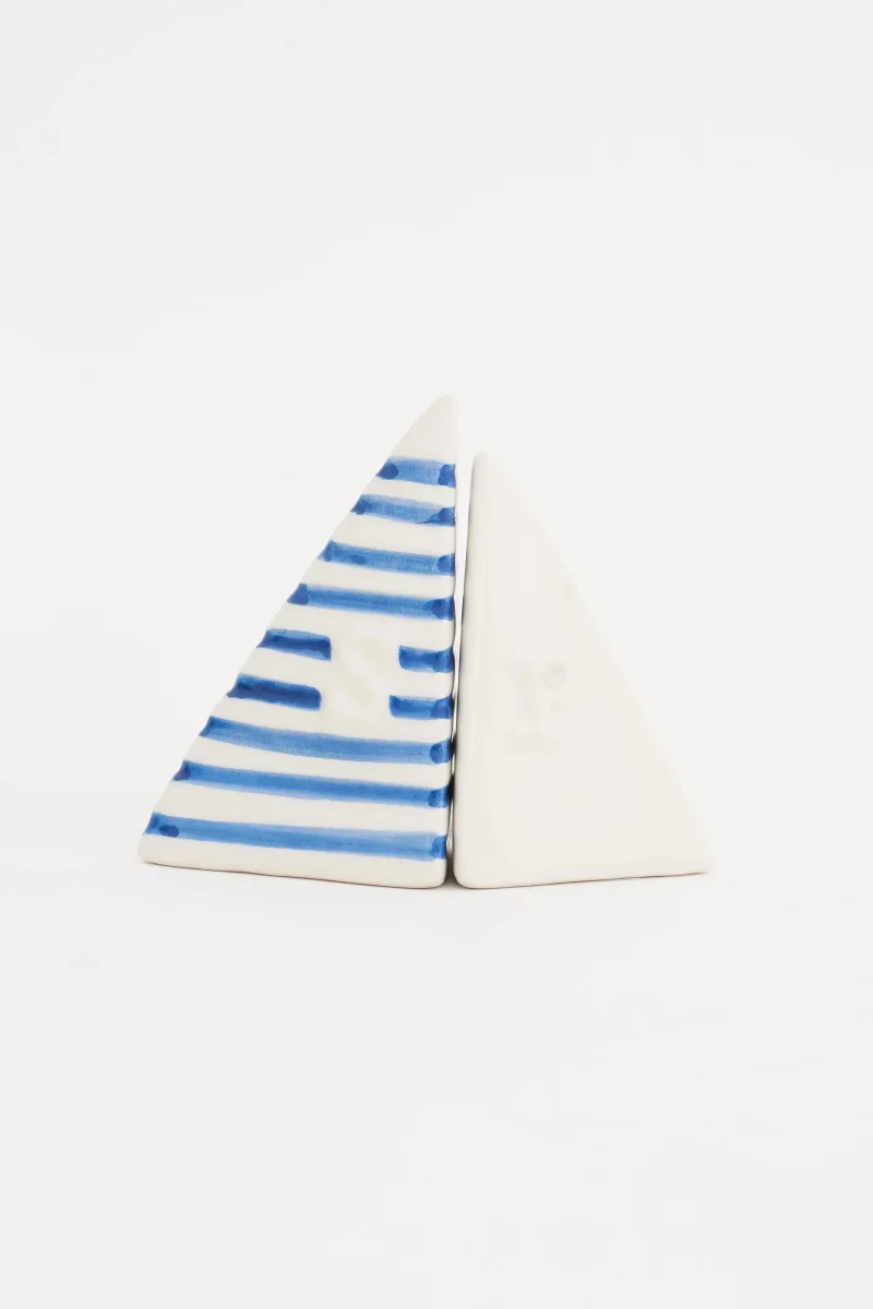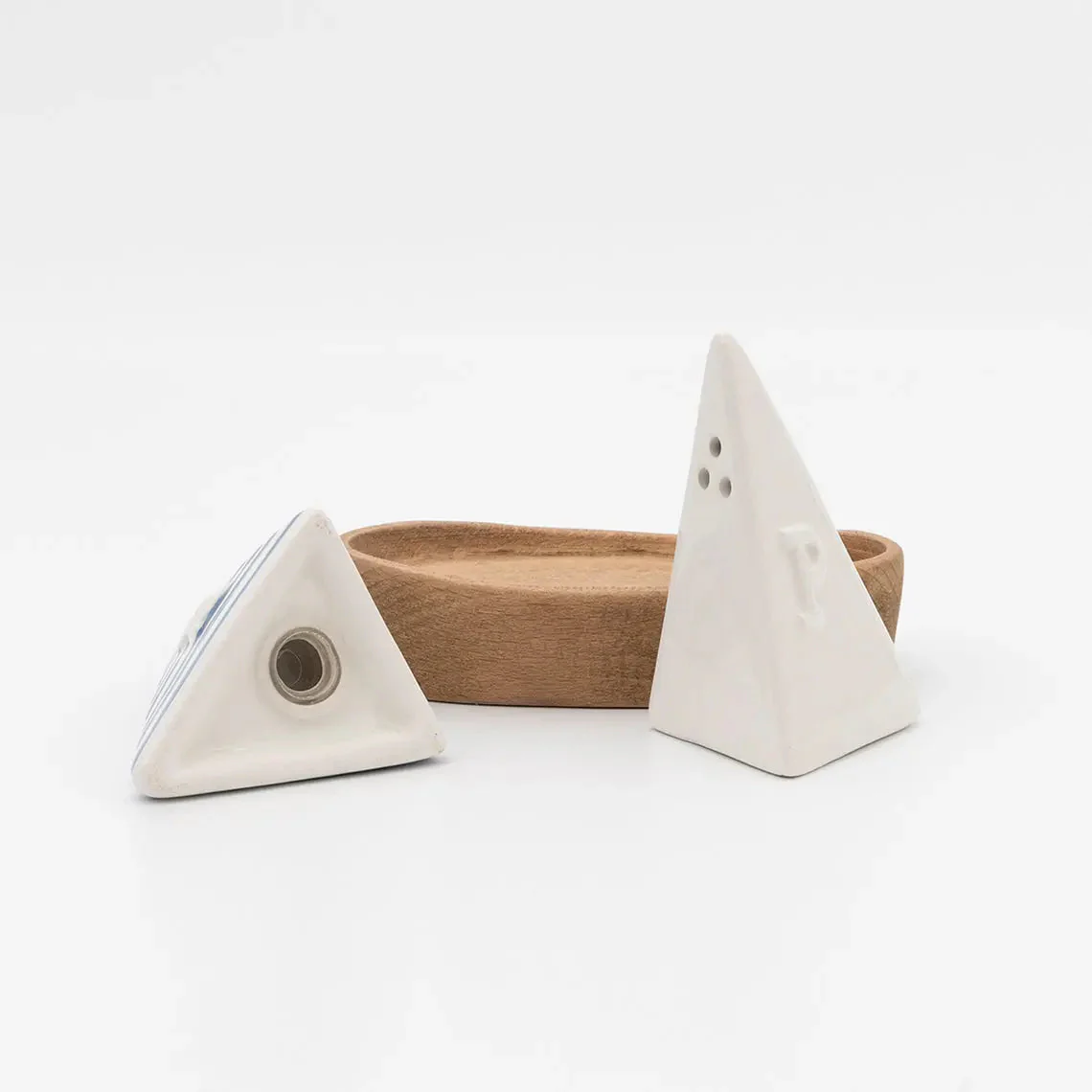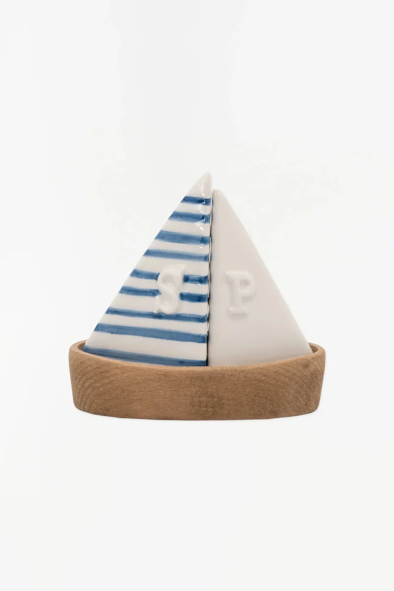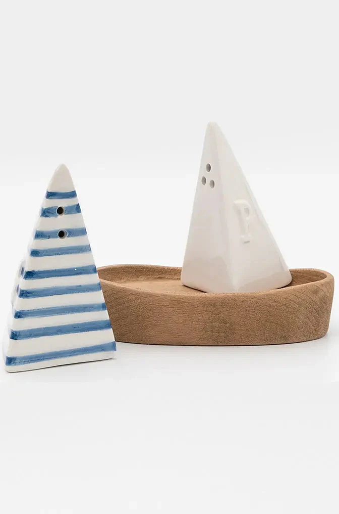 Salero y pimentero de cerámica que imitan la forma de las velas de un velero. La base de madera emula el casco de la embarcación. Un regalo náutico perfecto.