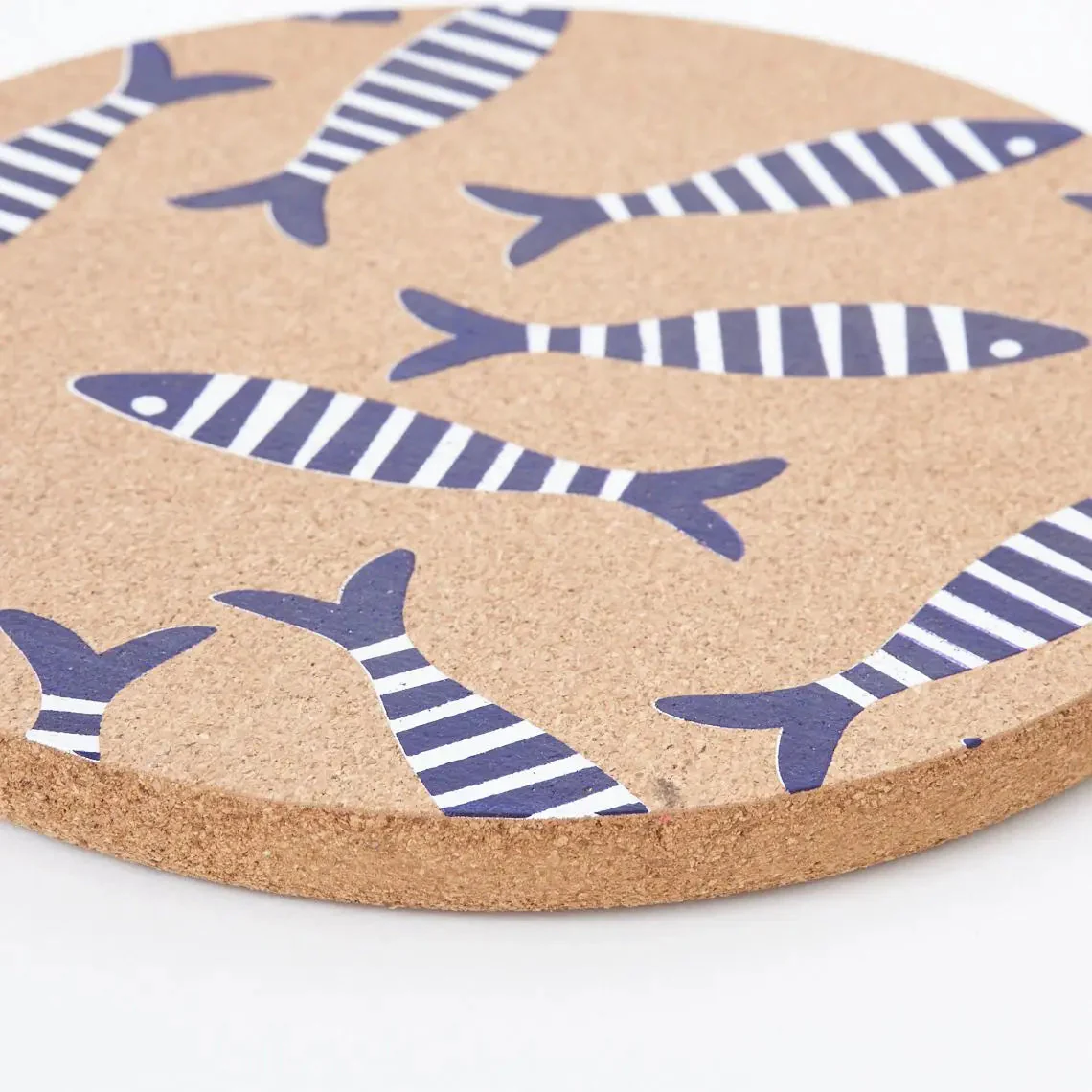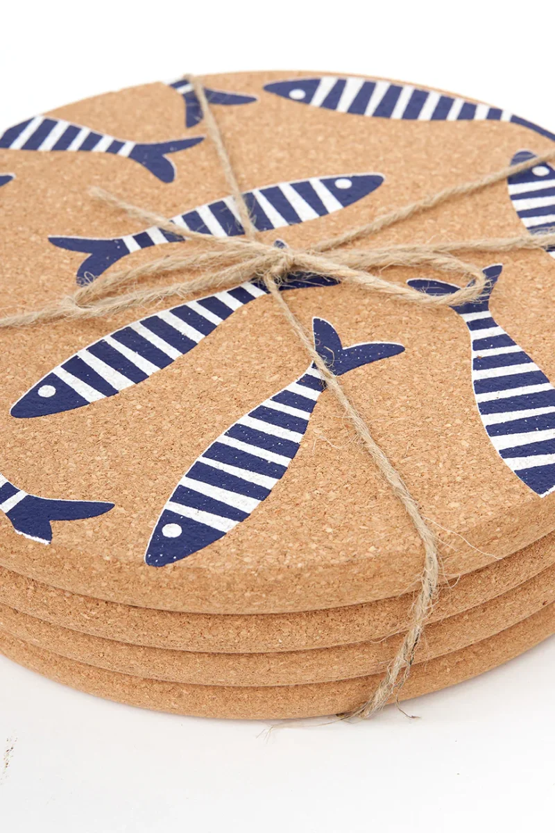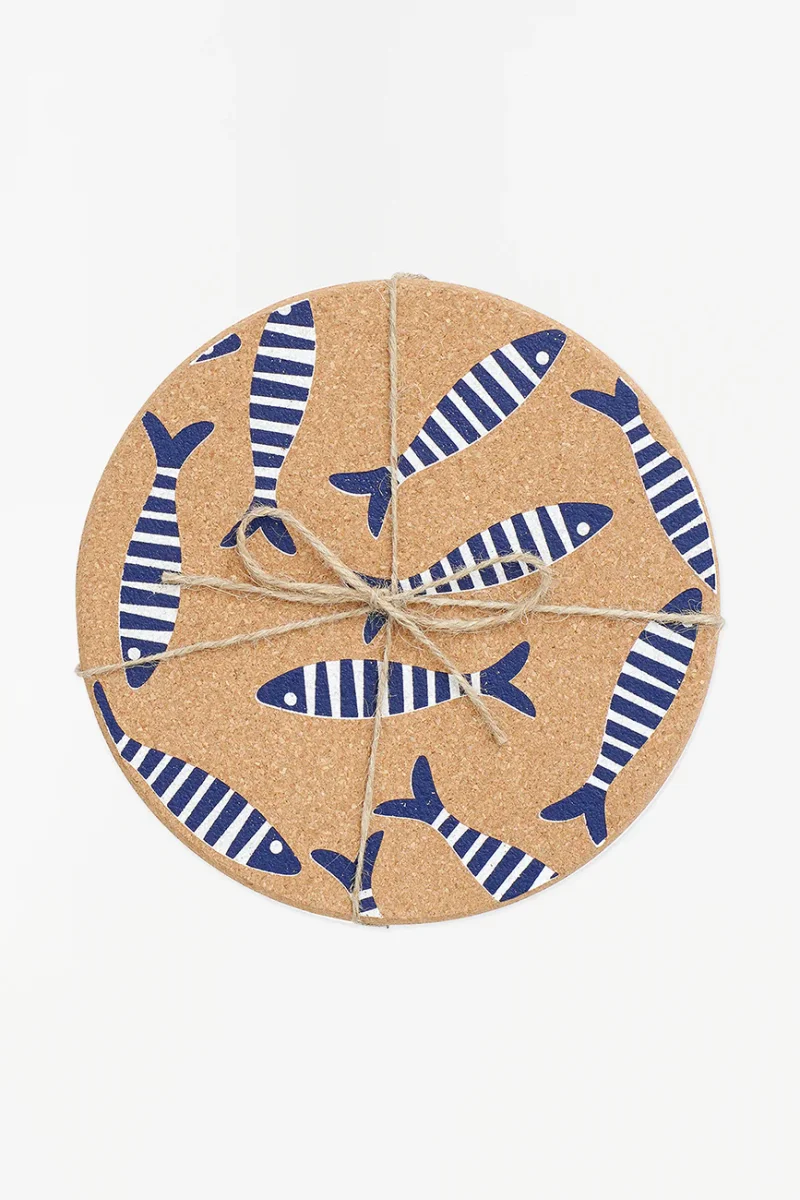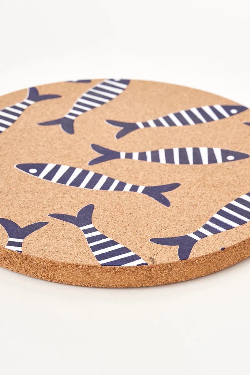 Salvamantel redondo de corcho decorado con dibujos de peces a rayas. Un accesorio práctico y divertido con el inconfundible toque marinero de Batela. Set de 4