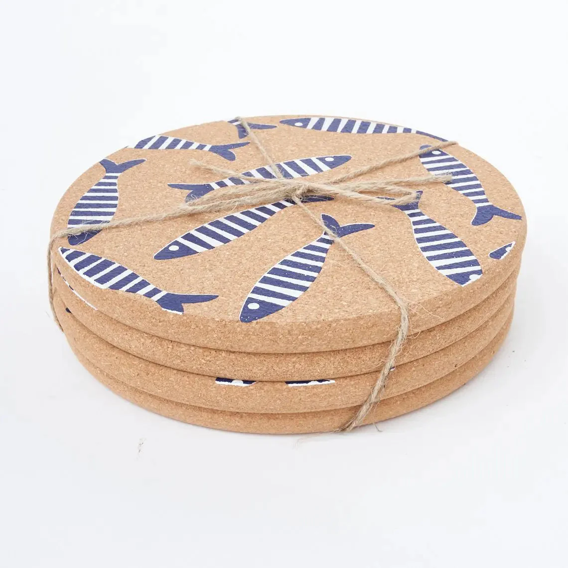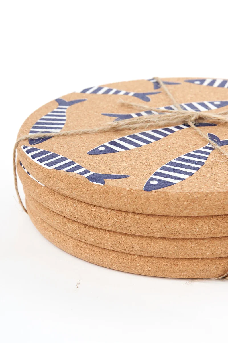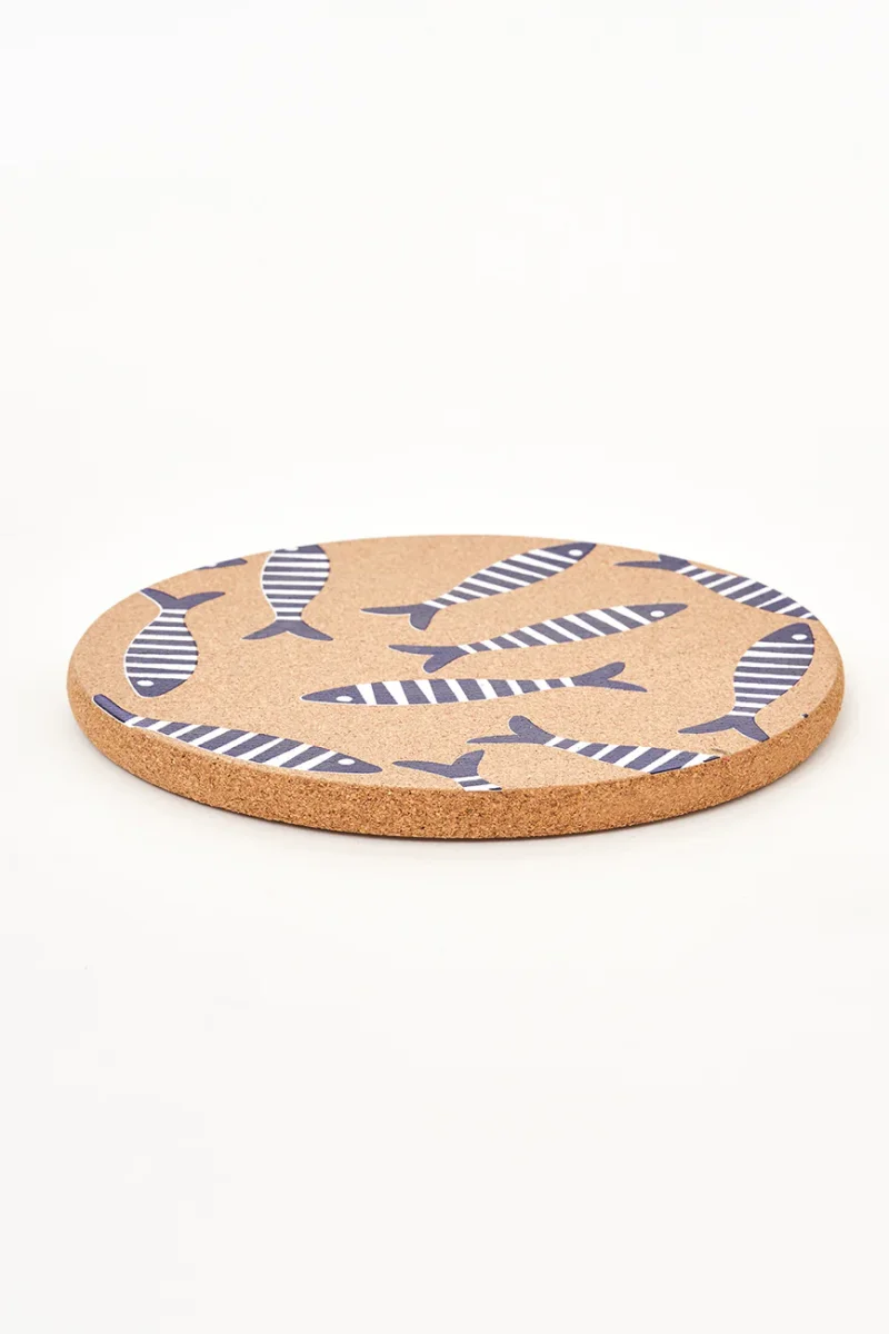 Salvamantel redondo de corcho decorado con dibujos de peces a rayas. Un accesorio práctico y divertido con el inconfundible toque marinero de Batela. Set de 4