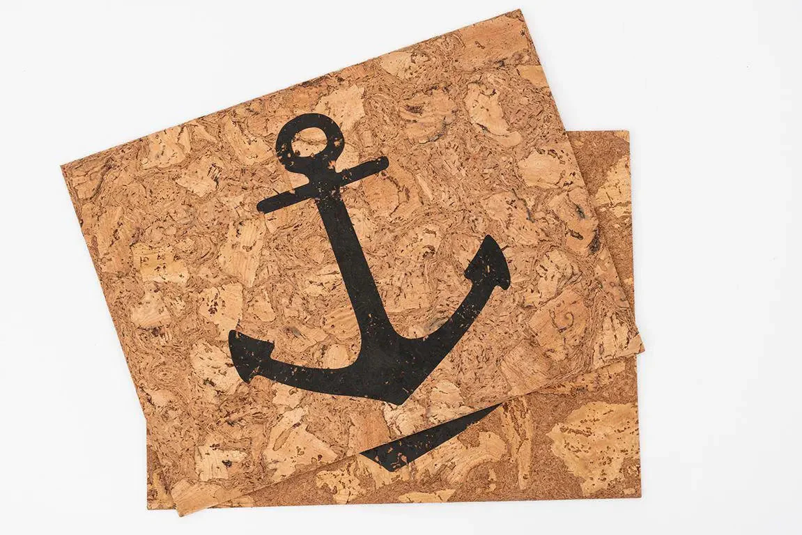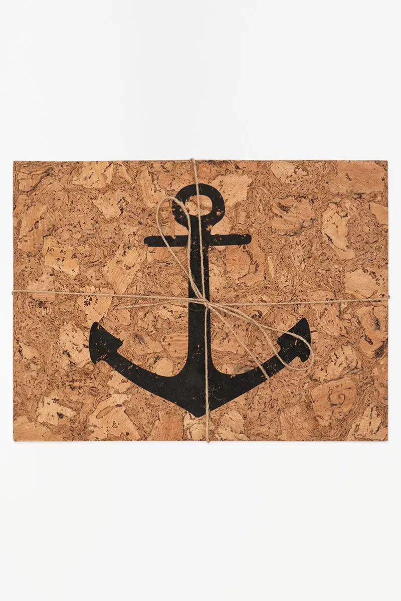 Salvamantel rectangular de corcho con un ancla impresa sobre él. Protege tu mesa del calor con este salvamantel de corcho con estilo náutico