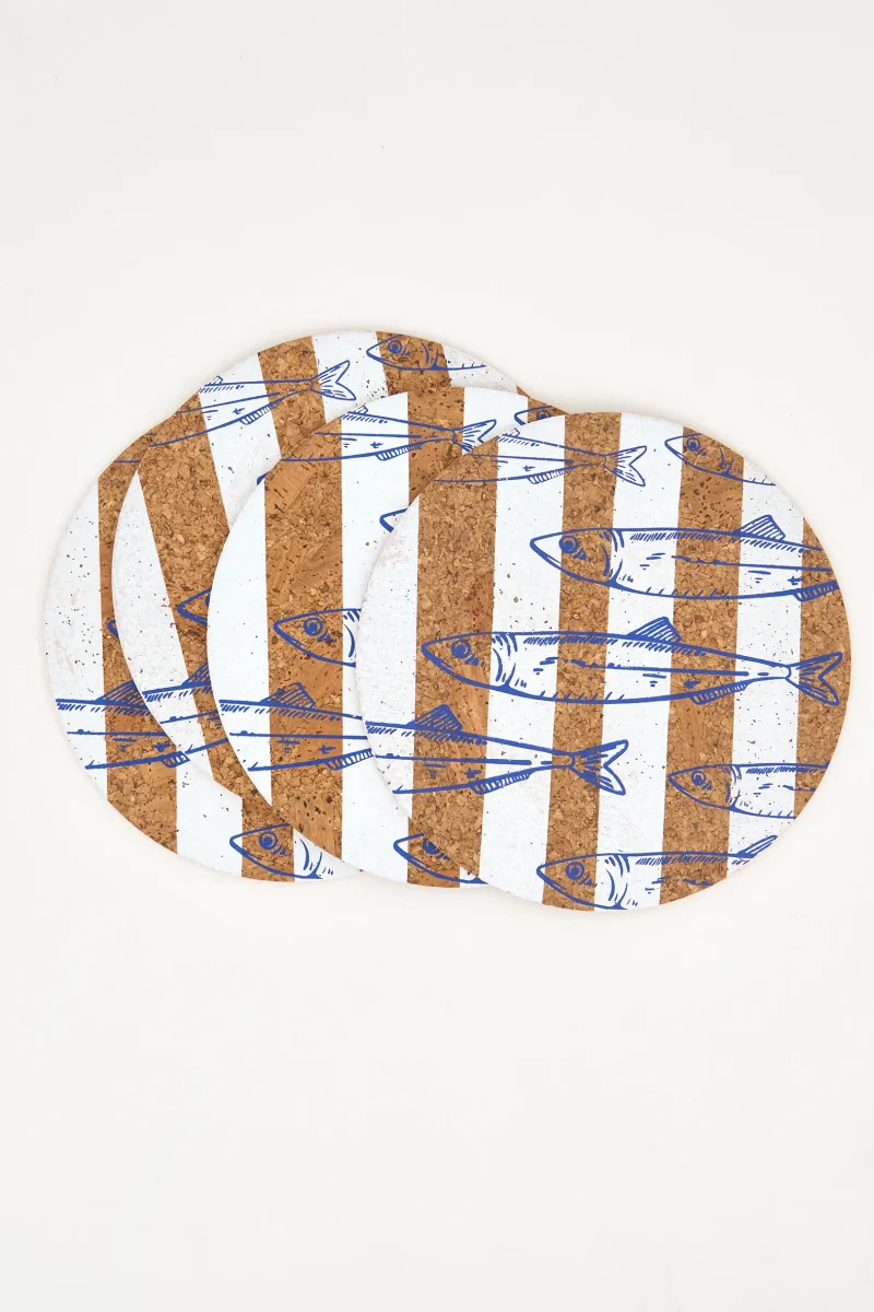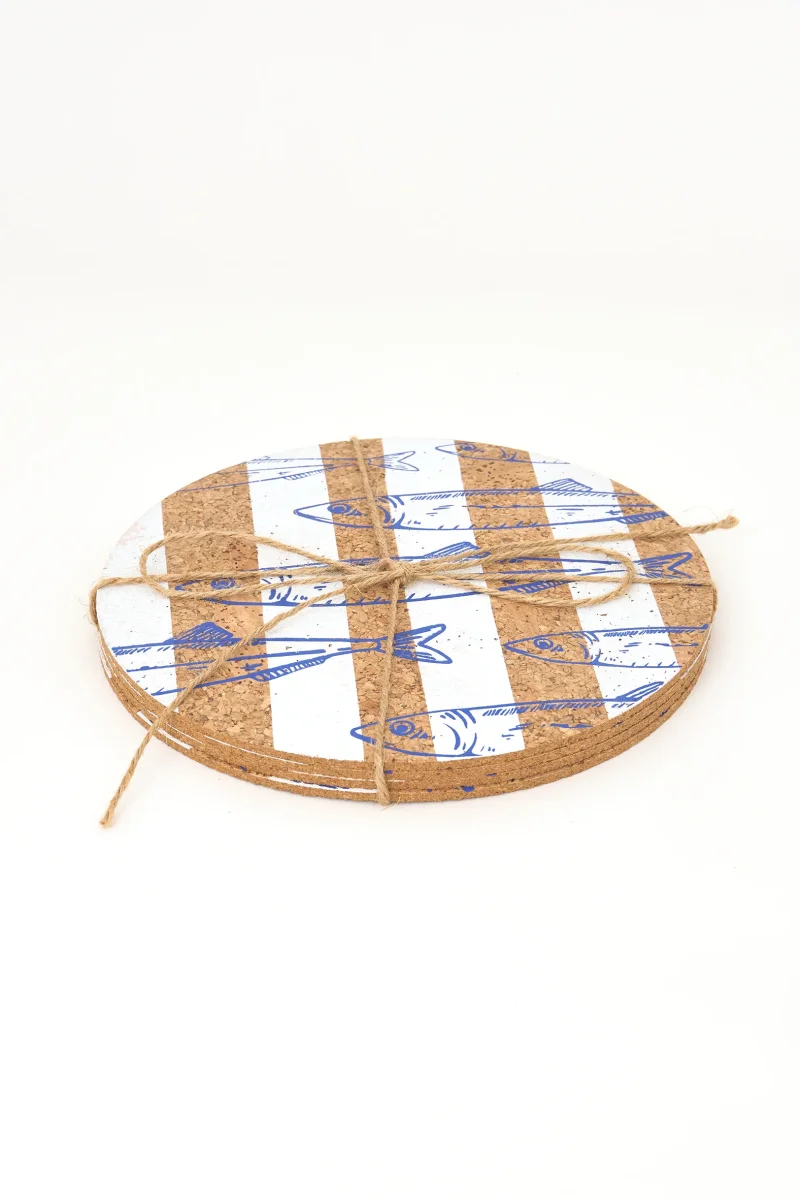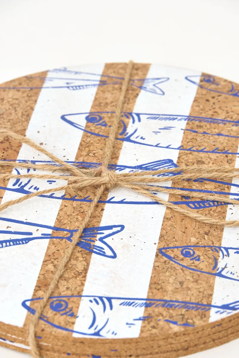 Salvamanteles redondo de corcho natural con ilustración de peces en tonos azules y rayas claras. Un diseño inspirado en el mar que protege la mesa del calor mientras aporta un toque fresco y artesanal