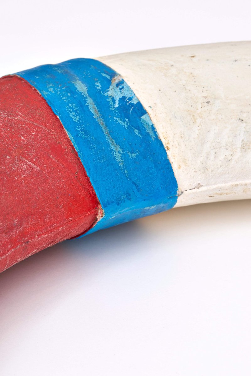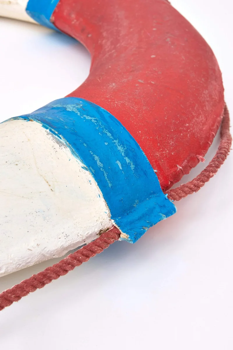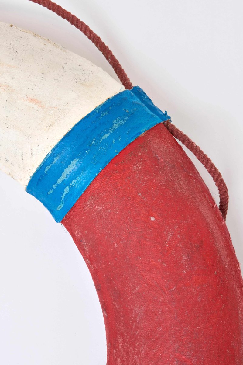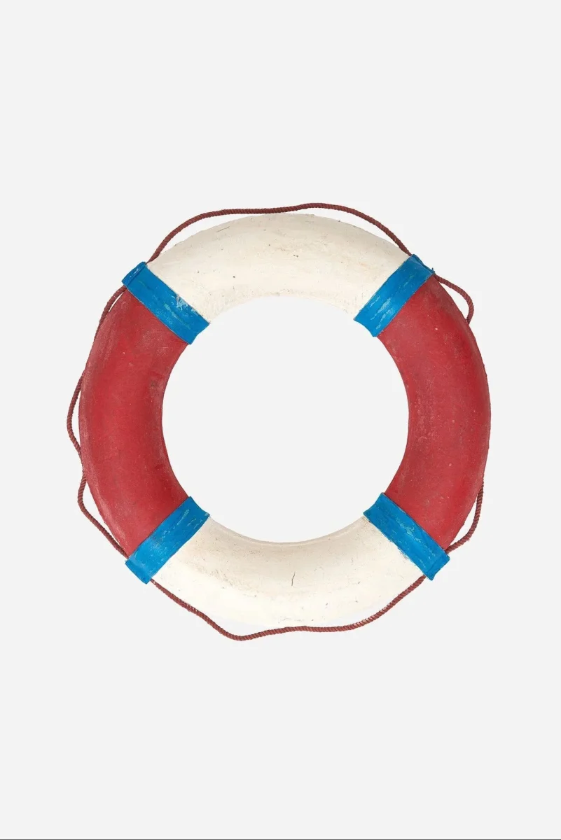 Salvavidas decorativo con acabado envejecido que simula el aspecto de uno real.